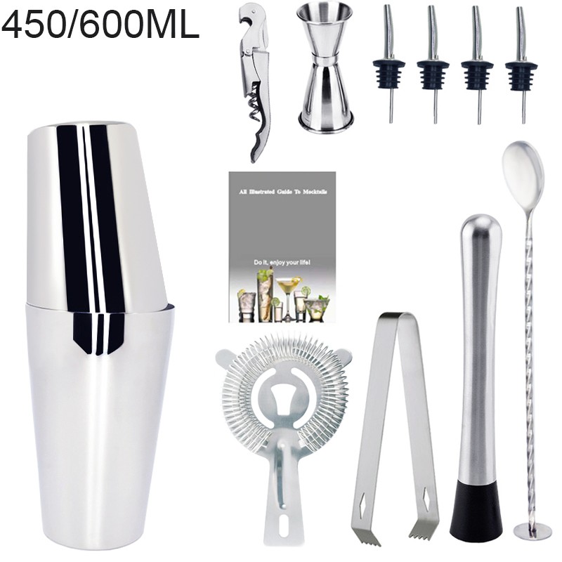 1 x Shaker, 1 x Muddler, 1 x Strainer, 1 x Ice Tongs, 1 x Spoon,4 x Pourer, 1 x 15/30ml Double sided jigger, 1 x Channel Knife, 1 x Cocktail Recipe.