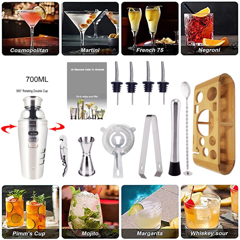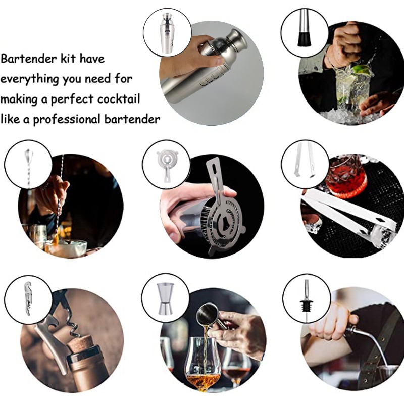 1 x Shaker, 1 x Muddler, 1 x Strainer, 1 x Ice Tongs, 1 x Spoon,4 x Pourer, 1 x 15/30ml Double sided jigger, 1 x Channel Knife, 1 x Bamboo, 1 x Cocktail Recipe.