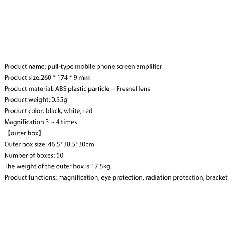 Caractéristique: 1. Écran d'affichage HD: l'écran miroir Fresnel adopte la technologie de zoom optique HD, qui peut agrandir la HD de 3 à 4 fois, empêchant efficacement les radiations générée par le téléphone portable. 2. Conception coulissante: étirez le bouton rond en silicone, puis l'écran apparaît. Ce mode d'écran coulissant aide à protéger l'écran et est plus adapté au transport. 3. Opération Simple: l'amplificateur d'écran double la taille de l'écran, de sorte que vous pouvez tirer le meilleur parti des films et des vidéos sur votre smartphone HD. Ajoutez un clavier compatible Bluetooth et utilisez-le pour jouer en HD. 4. Matériaux de haute qualité: plastique ABS et miroir Fresnel, solide et durable, encore plus haute définition. Cadre surélevé angle de vue réglable. Le coussin en silicone antidérapant protège et stabilise le téléphone. 5. Excellente compatibilité: que vous soyez pour iPhone ou un téléphone Android, l'écran du projecteur de la loupe peut être utilisé avec votre appareil. Le plaisir visuel 3D peut éviter la fatigue visuelle. Spécification: Matériau: plastique ABS + lentille de phénix Grossissement: 3-4 fois Fonctions: amplification, protection des yeux, protection contre les radiations, support de support Taille du produit: 260*175*10mm/10.23*6.88*0.39'' Couleur: noir, blanc, rouge Remarque: Veuillez permettre des différences de 1 à 3mm en raison de la mesure manuelle. En raison de l'affichage différent et de la lumière différente, l'image peut ne pas montrer la couleur réelle de l'article. Merci de votre compréhension. ![]() 1 X loupe d'écran de téléphone portable ![]() ![]() ![]() ![]() ![]() ![]() ![]() ![]() ![]() ![]() ![]() ![]() ![]() ![]() ![]() ![]() ![]() ![]() ![]() ![]() ![]() ![]() ![]() ![]() ![]() |