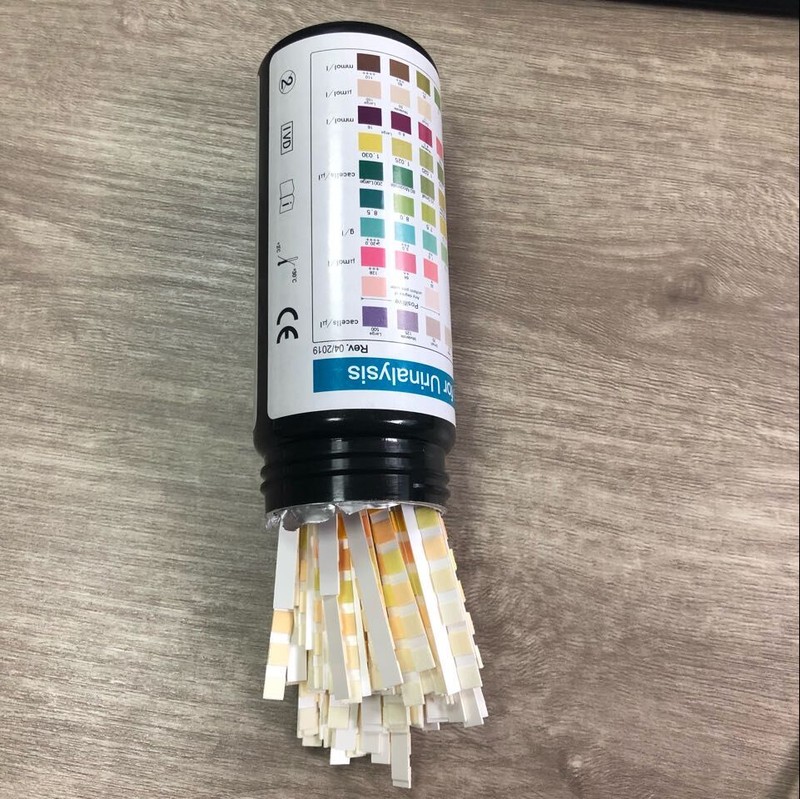It tests Leukocytes, Nitrite, Urobilinogen, Protein, pH, Blood, Specific Gravity, Ketone, Bilirubin, Glucose.