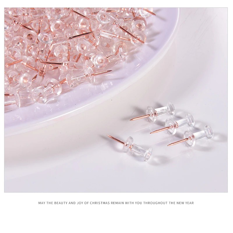 Materiale: Metallo + Plastica Formato della scatola: app.10.7x7.3x1.7cm/4.21x2.87x0.67inch Spilli Formato: app.2x0.8cm/0.79x0.31inch Colore: Oro Rosa + Trasparente Quantità: 50 pz/scatola, 100pcs
