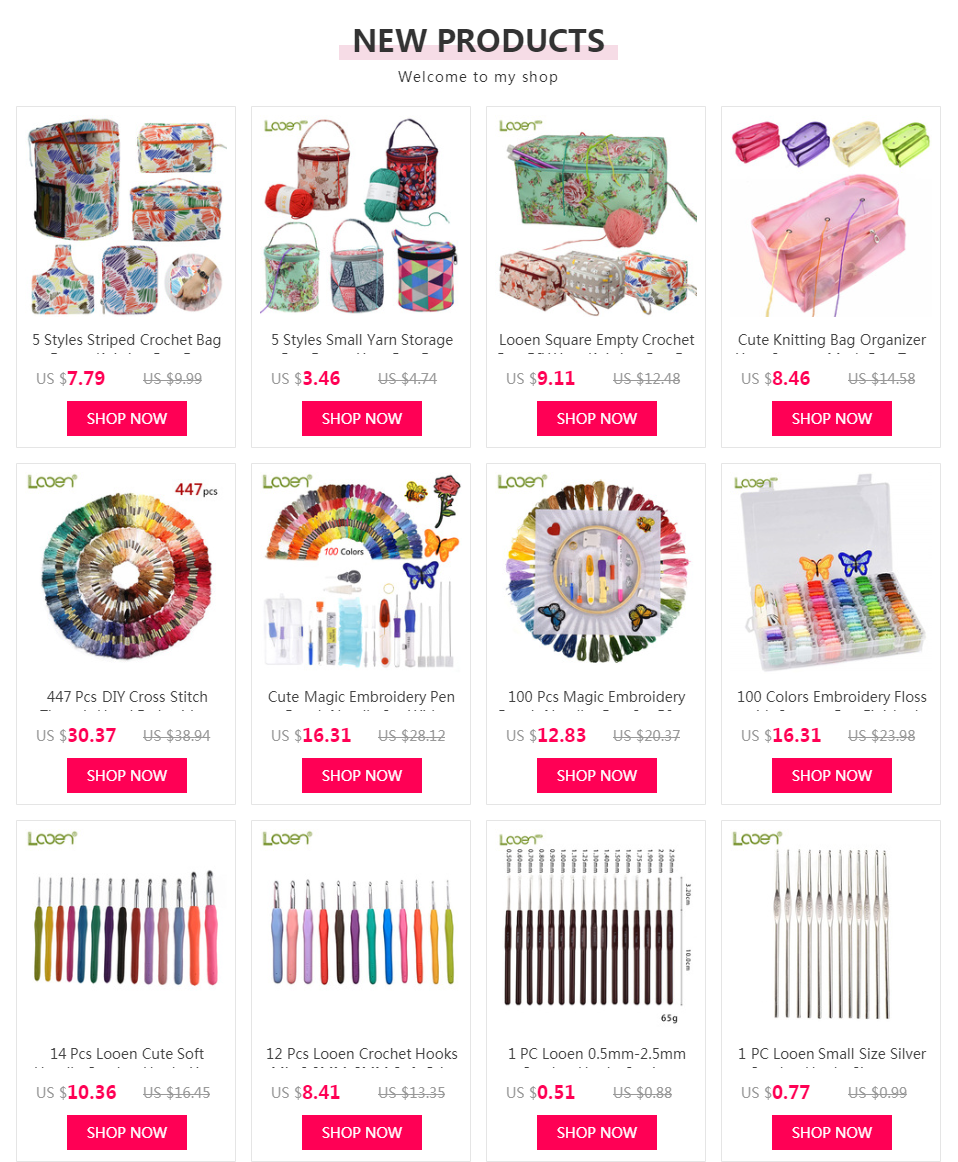 9 × كروشيه خطاف-الحجم: B (2.0 مللي متر) ، C (2.5 مللي متر) ، D (3.0 مللي متر) ، E (3.5 مللي متر) ، G (4.0 مللي متر) ، 7 (4.5 مللي متر) ، H (5.0 مللي متر) ، I (5.5 مللي متر) ، J (6.0 مللي متر)