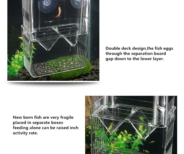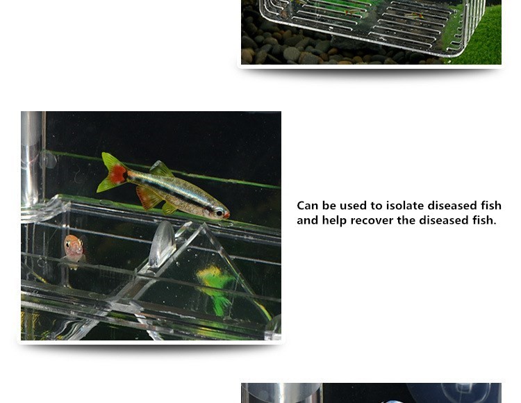 Producto de uso doméstico práctico y duradero Se puede utilizar como caja de desove para peces vívidos. Evita que los peces adultos ataquen para mejorar la tasa de supervivencia de los peces juveniles. Función de aislamiento: peces agresivos puede aislar, peces lesionados o peces pequeños. Diseño único de cubierta transparente, que evita que los peces salten de la caja. Las ventosas de alta calidad se pueden utilizar para fijar el producto cómodamente. Diseño flotante, combinación de capas dobles, ahorrando espacio.