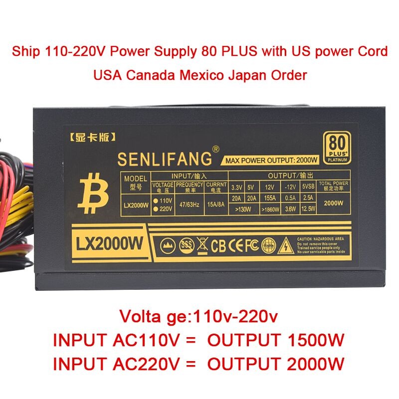 • Блок питания для майнинга ATX, 2000 Вт, 180-260 В высокая эффективность 95% для Ethereum ETH S9 S7 L3 8GPU карт, поддержка макс.