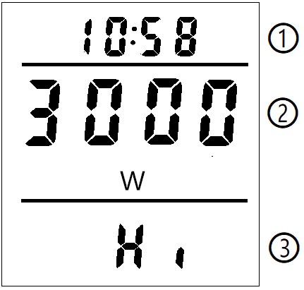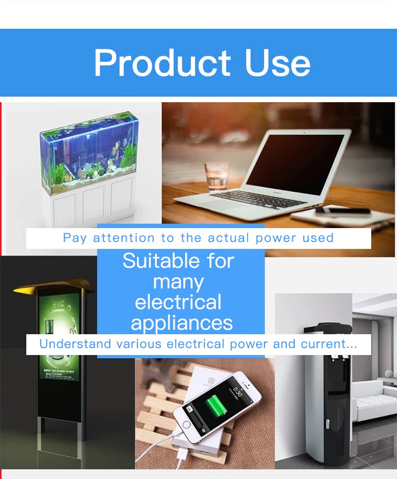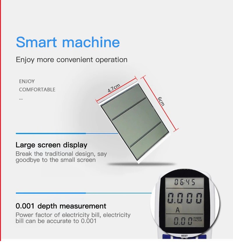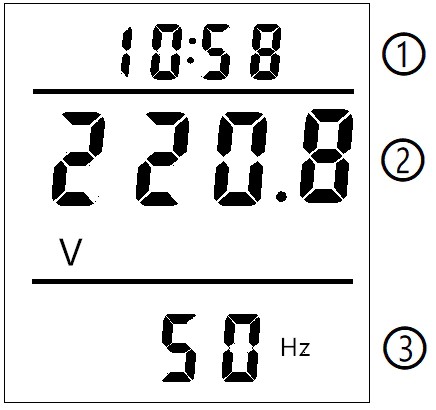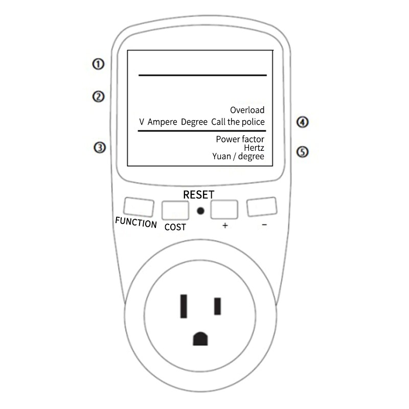 ① 시간 표시 줄; ② 전압/전류/전력/전력 소비 값; ③ 역률/주파수/전기 값; ④ 볼트: 전압; 암페어: 전류; (Kwh) 도: 전기 소비; 와트: 힘; 하중 초과 경보: 힘 하중 초과 신호. ⑤ 동력 인자: 명백한 힘에 활동적인 힘의 비율; Hertz: AC 주파수; 일: 전기 소비의 누적 일; Yuan: 전력 소비의 총계; 정도: 누적 전기 소비; 위안/학위: 전기의 단가.