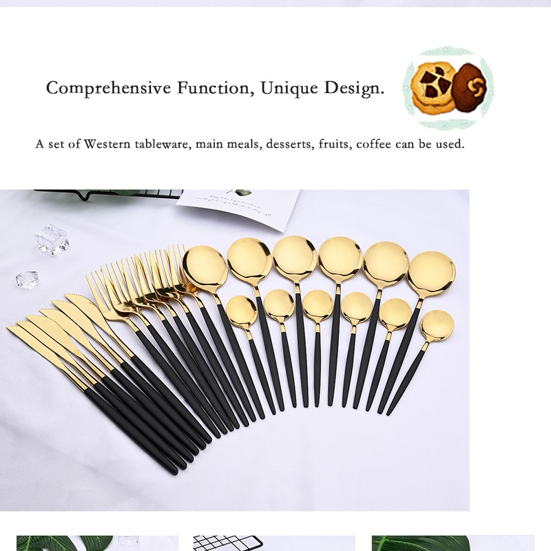 • Service De Vaisselle Occidentale En Acier Inoxydable Noir, Set De Couverts Et Argenterie, Coutellerie Fourchette Couteau Cuillère Pour La Table, 24 Pièces