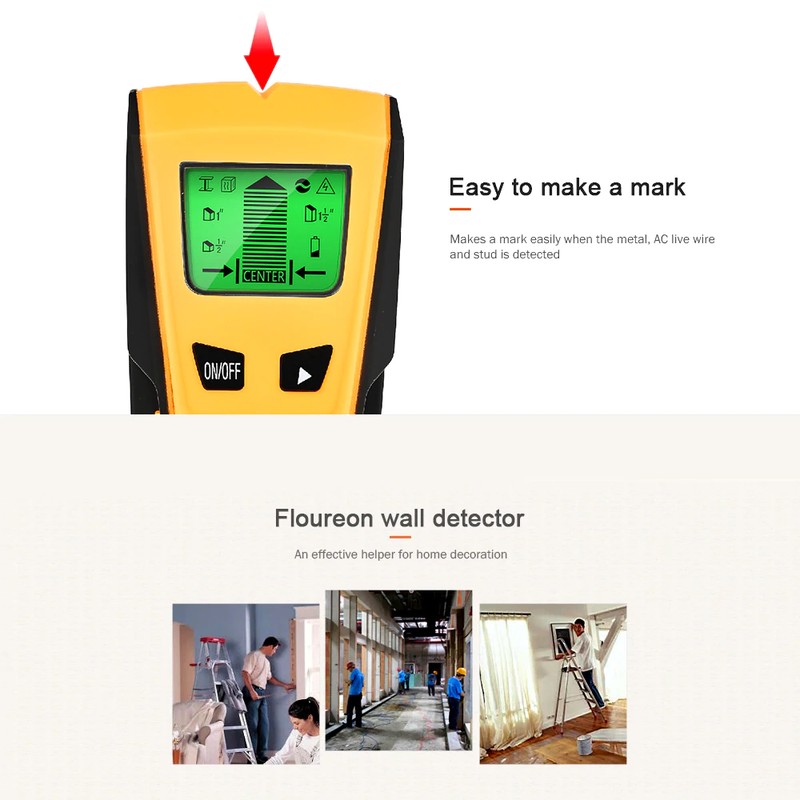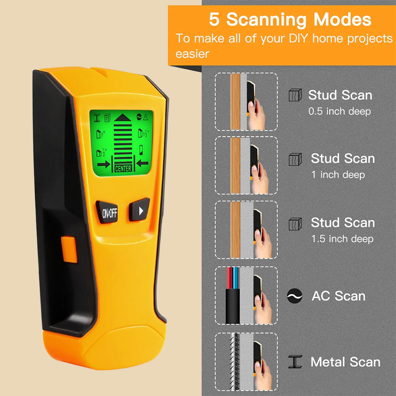 【 5 dans 1 Stud Finder Profonde Detection】 Le numérique mur scanner a 5 modes de balayage, comprend 1/2 ", 1" et 1-1/2 "mode de balayage à localiser le centre et bord de woods, faisceau, solives, métaux ou profondément des objets embarqués; Métal mode de balayage à détecter les métaux ferreux et non-ferreux jusqu'à une profondeur de 2.36 pouces; AC scanner détecte non blindé tension lignes jusqu'à 2 pouces.