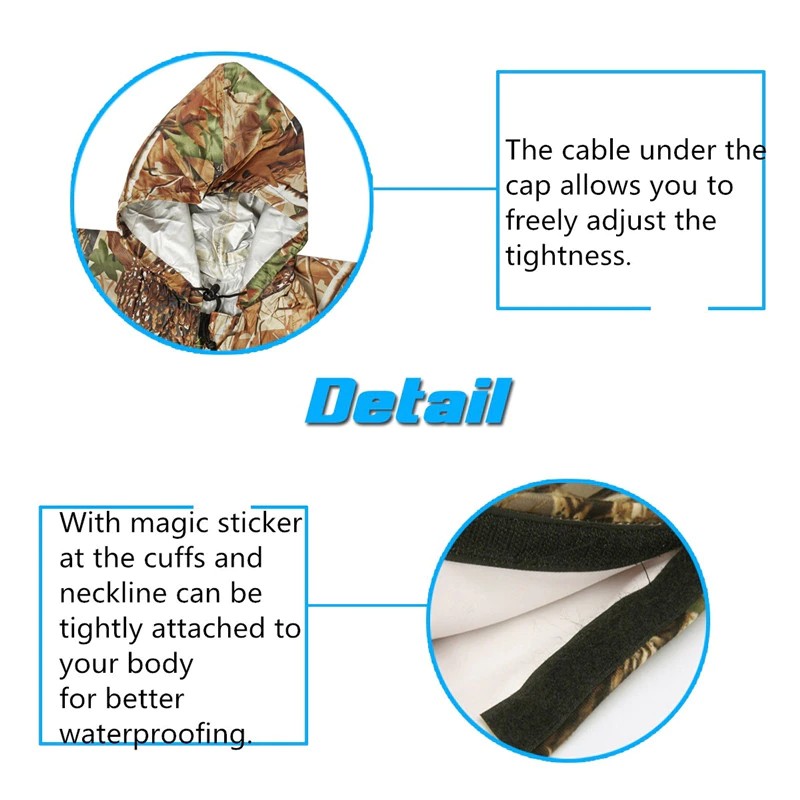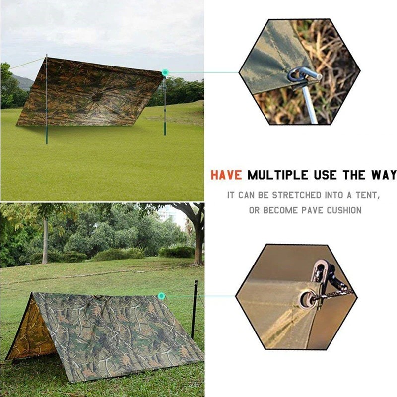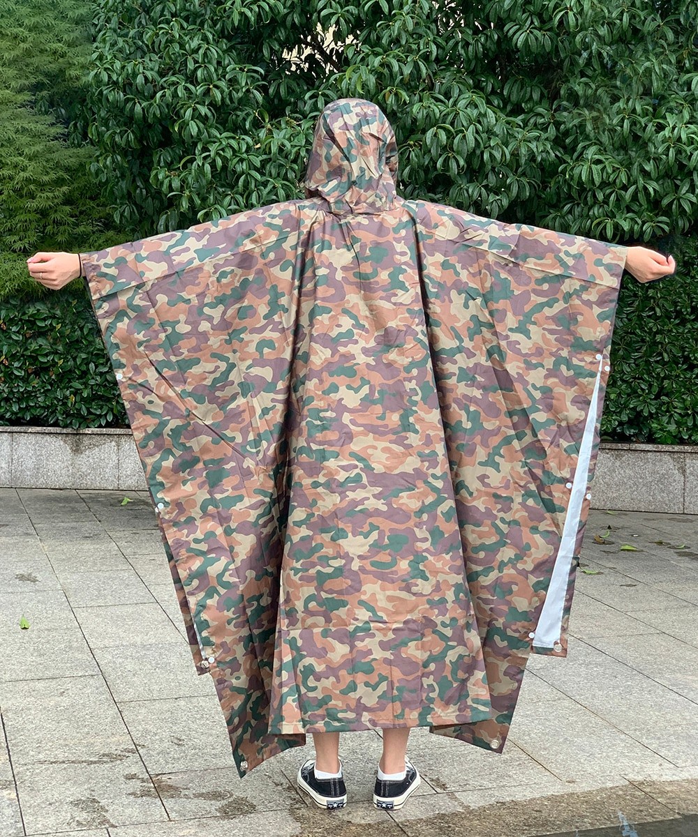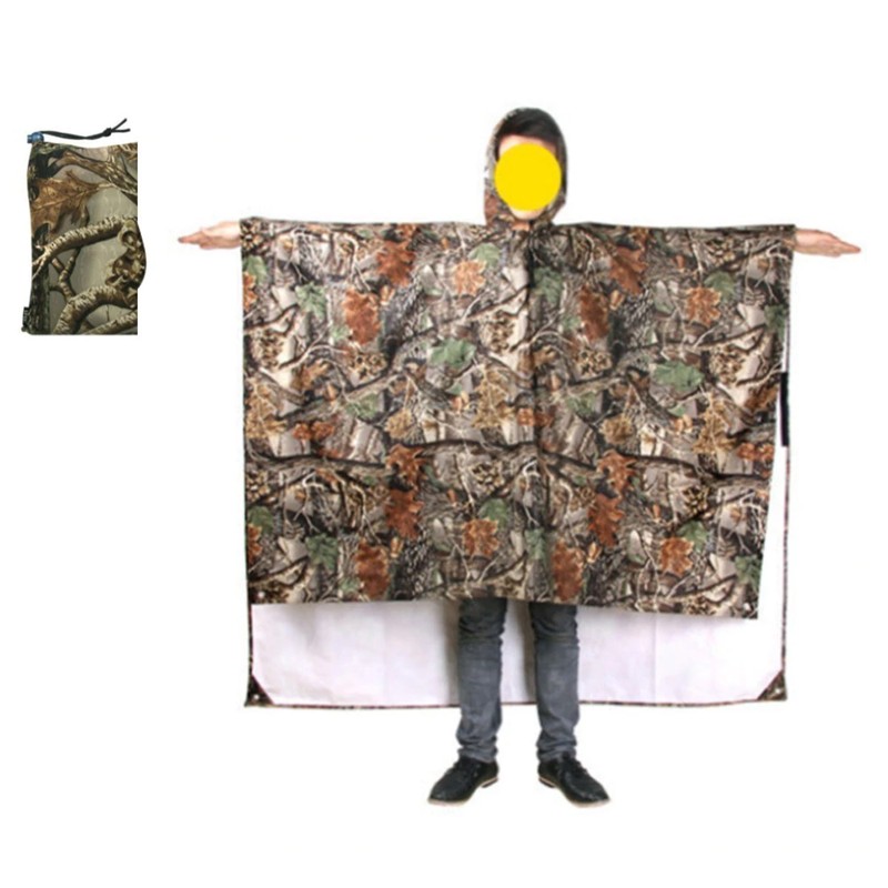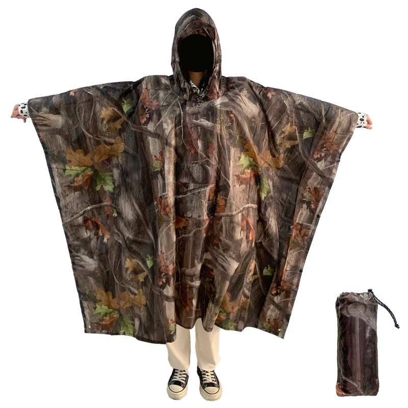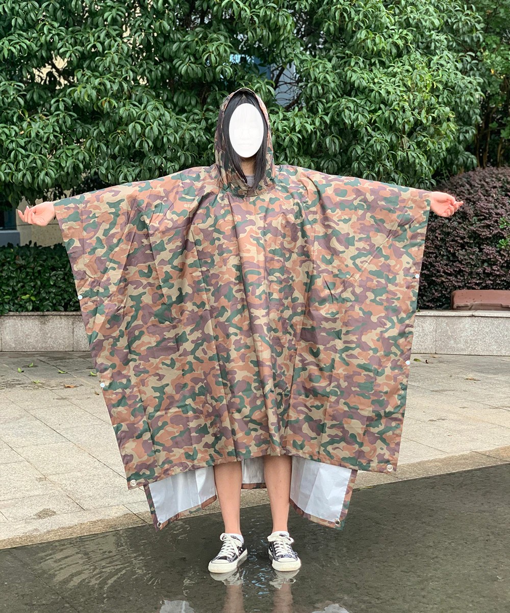 Chubasquero militar de camuflaje con capucha hecho de nailon resistente al agua de alta calidad. Este poncho ripstop es 100% impermeable y se llama ripstop debido al tejido especial que atraviesa el material. Originalmente es un tejido de material de diseño militar que se utiliza en muchas telas y aplicaciones. También permite que el material sea más ligero sin perder fuerza. Un artículo multifunción tiene ojales en el dobladillo para usarlo como refugio o lámina de tierra,. Y presione los tacos en los lados para usarlo como funda de saco de dormir o incluso como poncho.