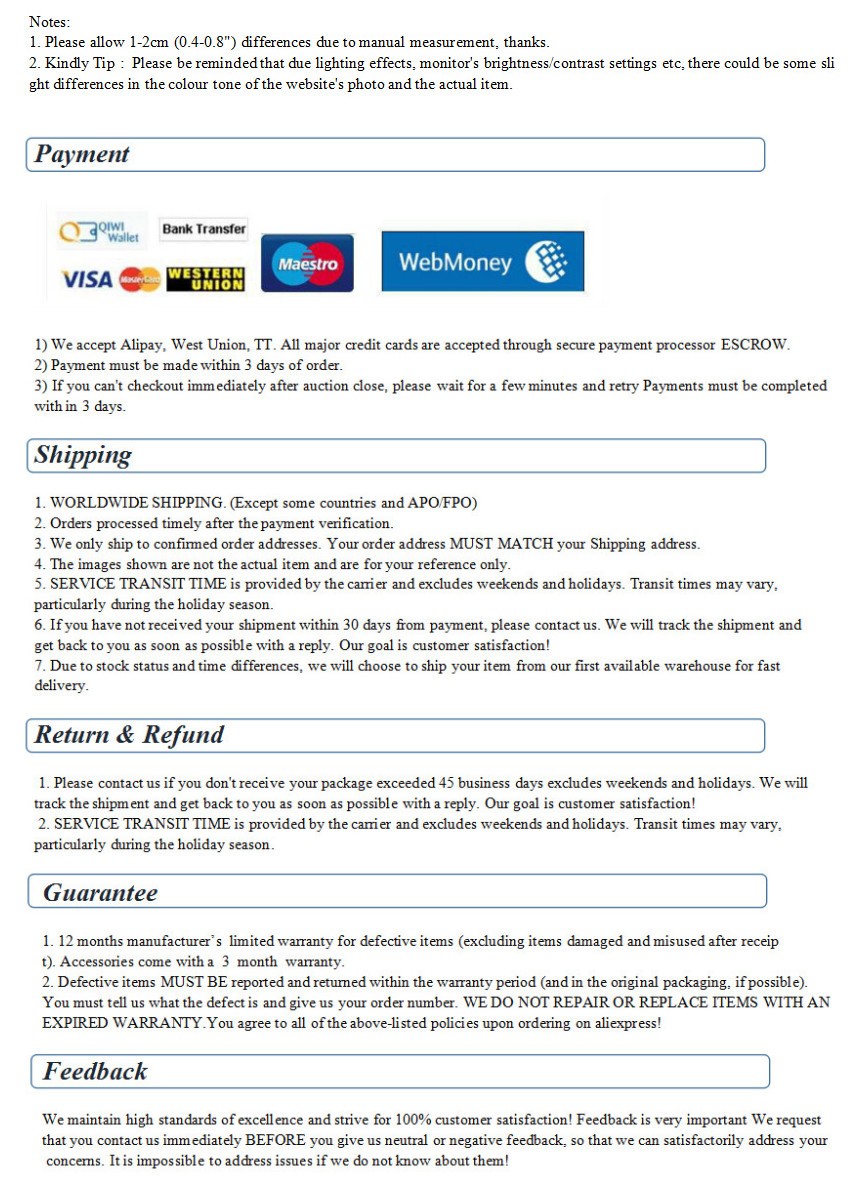 Confronta i formati del particolare ad i vostri, si prega di consentire errore di 1-3cm, dovuto la misura manuale.