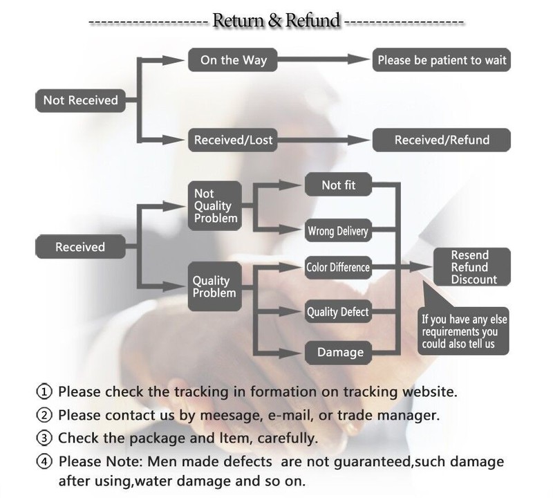 5. Если продукт, который вы получили, имеет какие-либо проблемы с качеством, мы повторно отправим или вернем Вам деньги как можно скорее