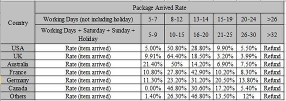 - يعتمد وقت التسليم على ناقل الشحن والجمارك وإرسال الوجهة وعوامل أخرى. يمكن استلام معظم الطرود في 20 يوم عمل (4 أسابيع). انظر أدناه لجمع وقت التسليم للبيانات الكمية: