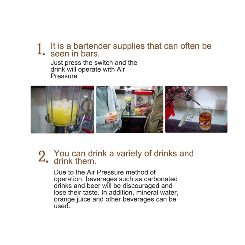 هذا موزع المشروبات هو مناسبة للنبيذ والبيرة والويسكي والفودكا والعصير والماء ، ويمكن استخدامه على نطاق واسع في الحانات والفنادق والمنازل والشاي وktv والمنازل ،كافتيريا، الخ.