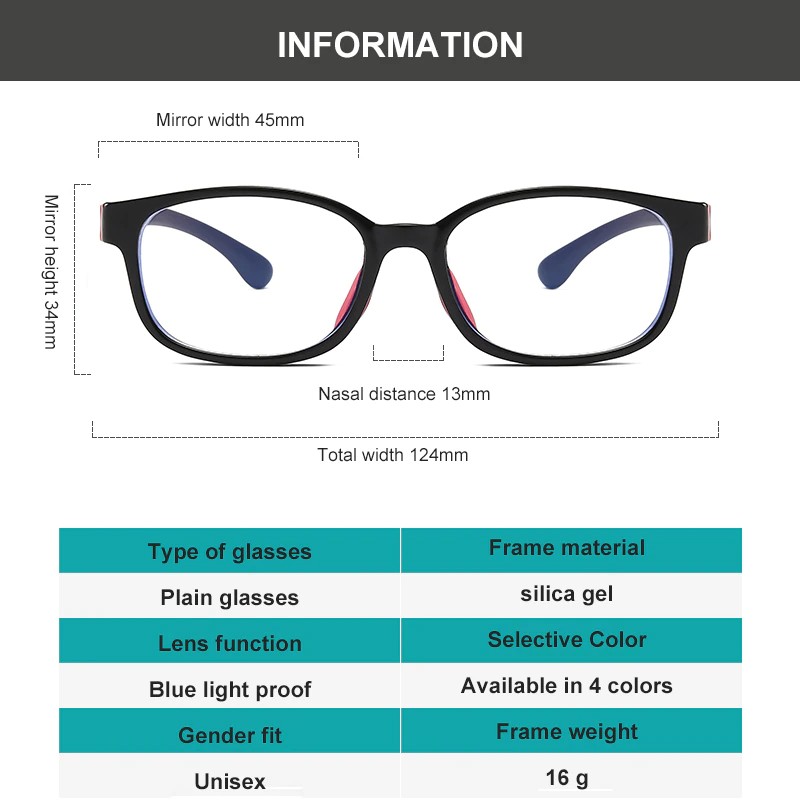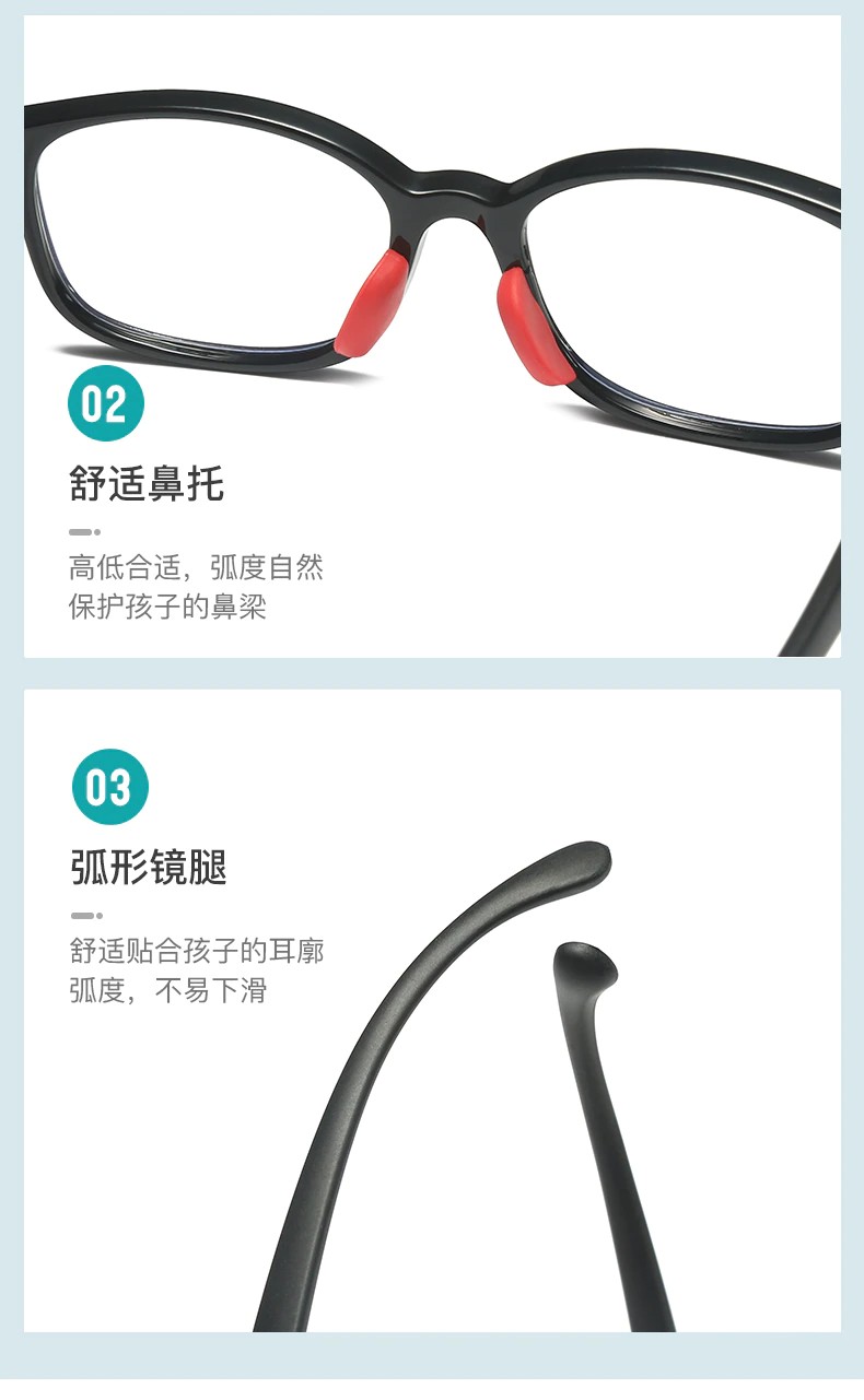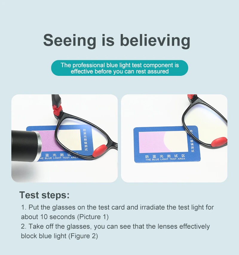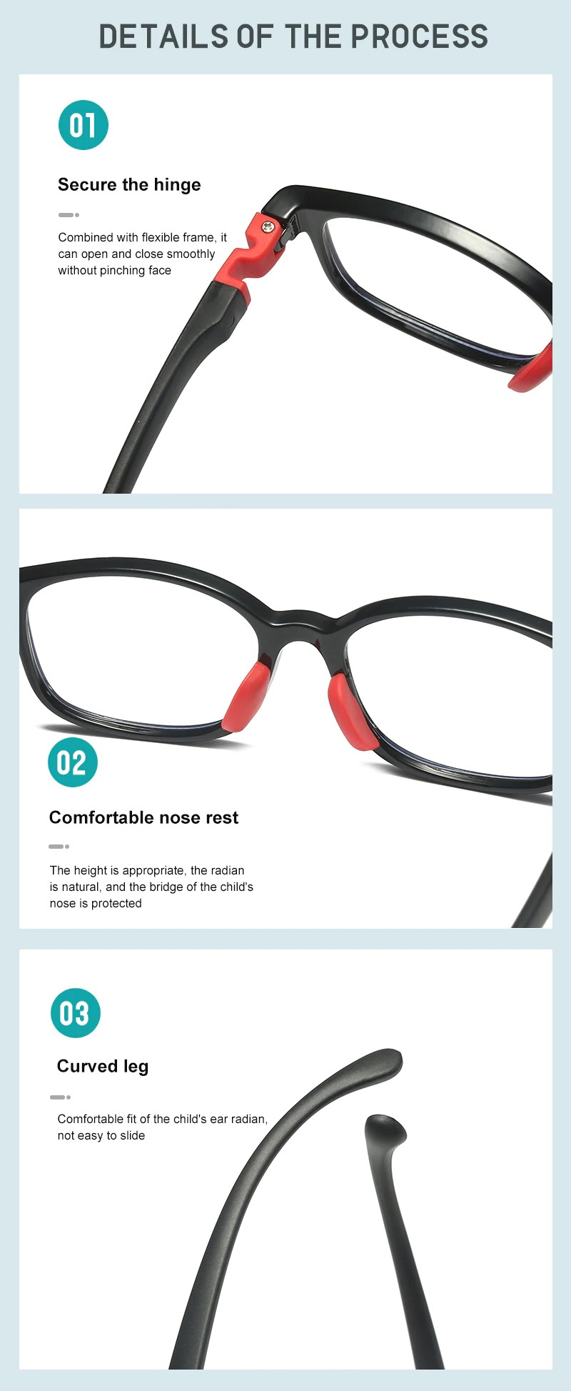 نظارات واقية من الضوء الأزرق لحماية البصر للأطفال: تستخدم نظارات الأطفال لدينا عدسات جديدة مضادة للضوء الأزرق لحماية عيون الأطفال والحد من تلف العين الناجم عن الضوء الأزرق عند لعب الألعاب ومشاهدة مقاطع الفيديو. العدسة ليس لديها وظيفة التكبير ويمكن استبدالها مع عدسة وصفة طبية. يمكن للنظارات لدينا أيضًا منع كمية معينة من الإشعاع ، بحيث يمكن للأطفال الاستمتاع بوقت رقمي دون القلق بشأن الضوء الأزرق الضار المنبعث من الهواتف المحمولة وأجهزة الكمبيوتر.