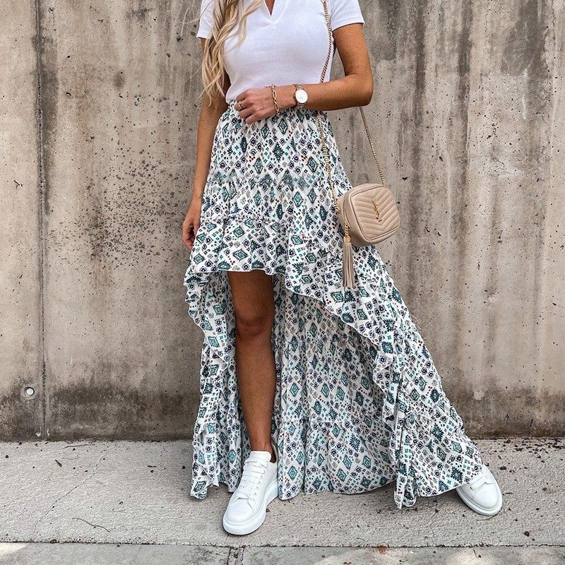 تنورة طويلة نسائية بوهيمية غير متماثلة تنورة للخريف والشاطئ منقوشة بالزهور تنورة غير رسمية بخصر عالٍ تنانير Faldas 2021