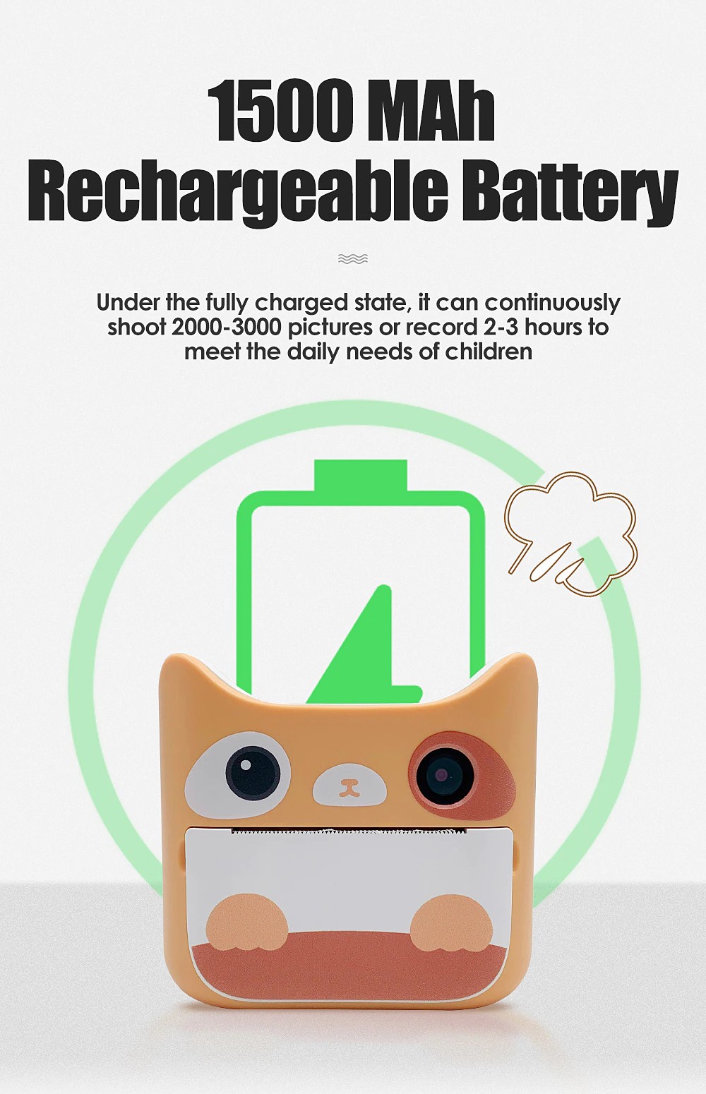 يمكن التصوير باستمرار 2000-3000 صورة أو تسجيل 2-3 ساعات لتلبية الاحتياجات اليومية للأطفال تحت الدولة المشحونة بالكامل.