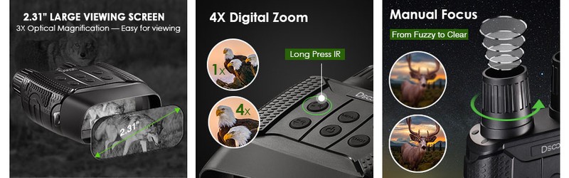 والتي تشمل 960P التقاط الصور وتسجيل الوظائف ، وتشغيل الفيديو ، وتعديل الأشعة تحت الحمراء على مستوى 7 ، تكبير بصري 3x ، وتكبير رقمي 4x.