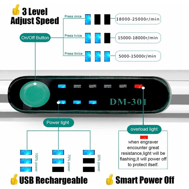 سرعة مرئية ضبط: ماكينة النقش على المعادن القلم يزود المحرك ممتازة ، السلطة تصل إلى 25 واط أثناء العمل. 3 وضع ضبط سرعة الدوران من 5000-25000 r/min لتطبيق حالات مختلفة. أدنى سرعة سوف تتيح لك تلميع الأظافر الخاص بك في آمنة ، وأعلى سرعة تعمل أيضا على نحت المعادن.
