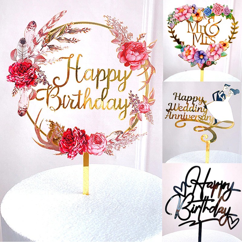 الزهور كعكة توبر عيد ميلاد سعيد الذهب الفضة حفلة عيد ميلاد كعكة إدراج الاكريليك كعكة الديكور الزفاف الكعك الحلوى ديكور