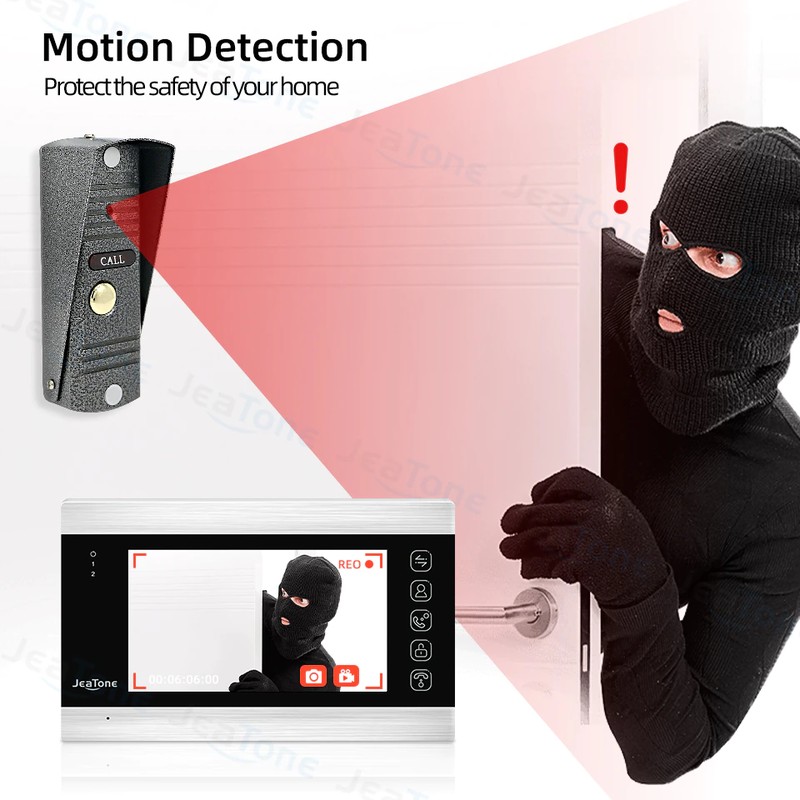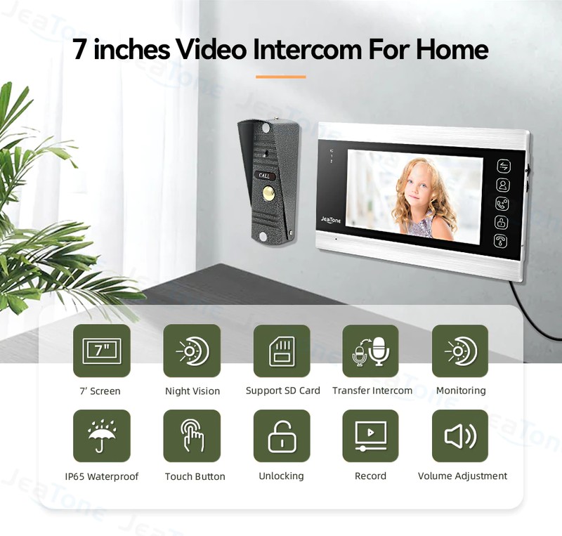 JeaTone 7 بوصة فيديو نظام اتصال داخلي يدعم ربط مجس الأشعة تحت الحمراء ، كاميرا التناظرية و قفل إلكتروني ، والتي يمكن أن تحمي منزلك والممتلكات في جميع الجوانب.