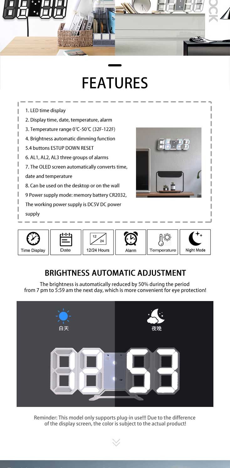 البطارية: CR2032 (تستخدم لتخزين الوقت عندما يتم قطع الطاقة (غير المدرجة) ، يتم تشغيل الساعة من قبل كابل يو اس بي)