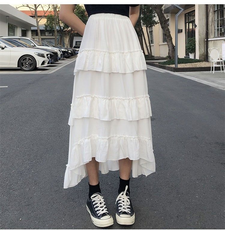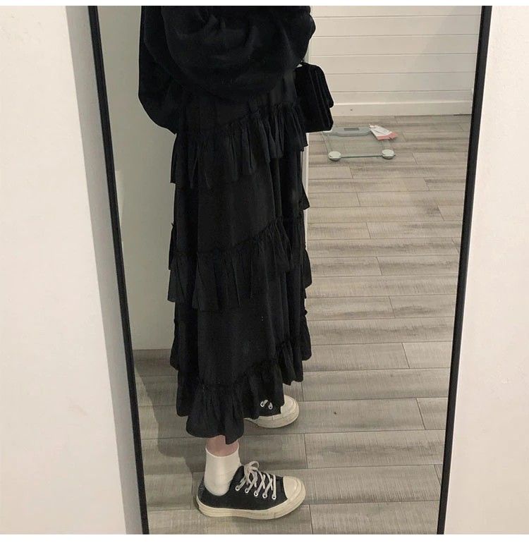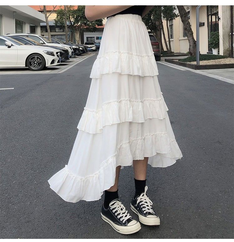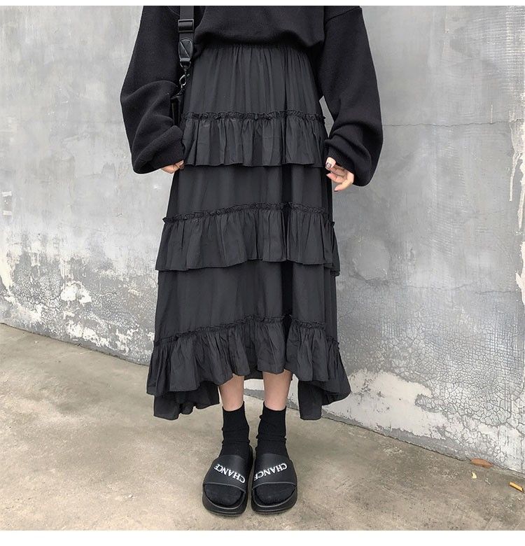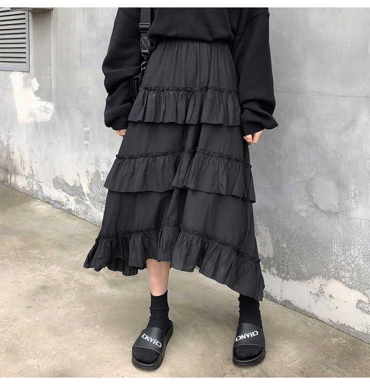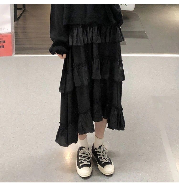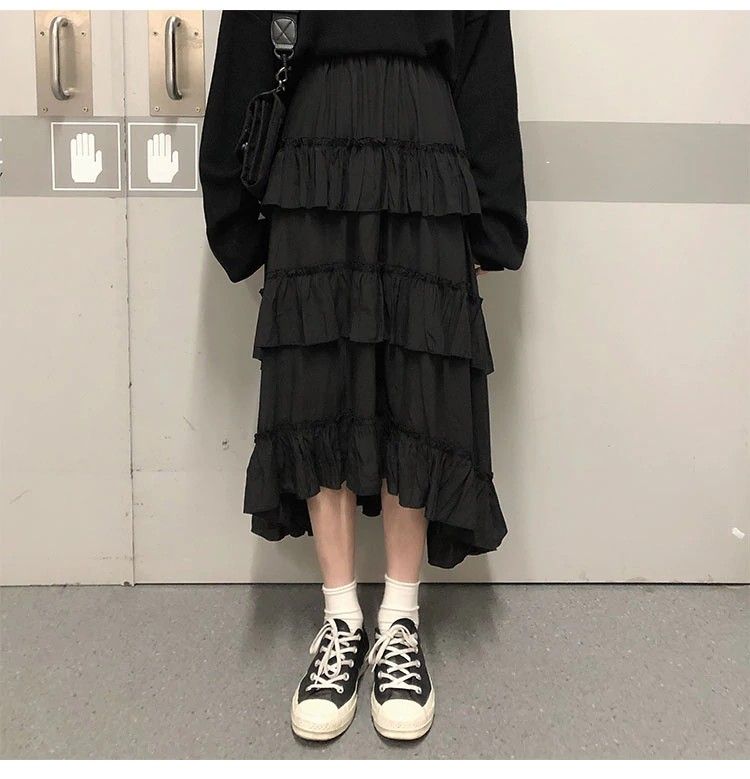 Qiukichonson ميدي التنانير الطويلة للمرأة ماكسي تنورة القوطي لوليتا الصيف عالية الخصر غير المتكافئة عالية منخفضة كشكش التنانير Rok