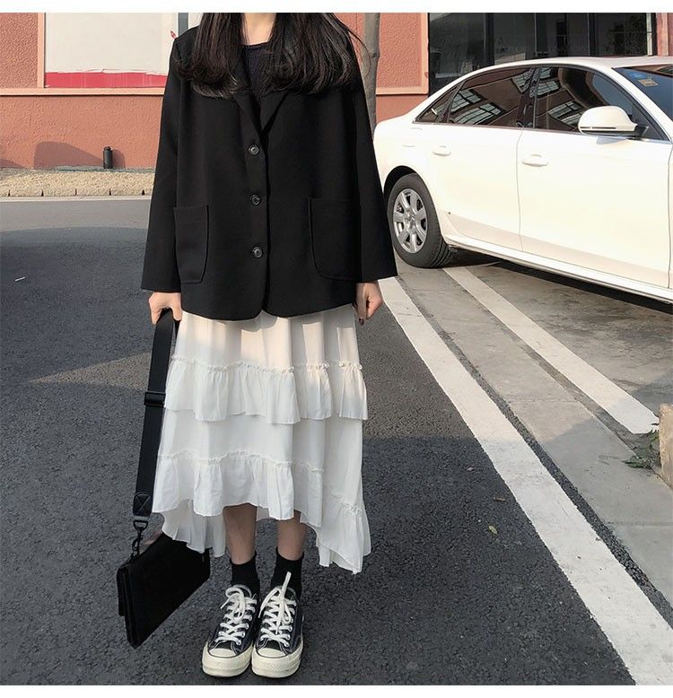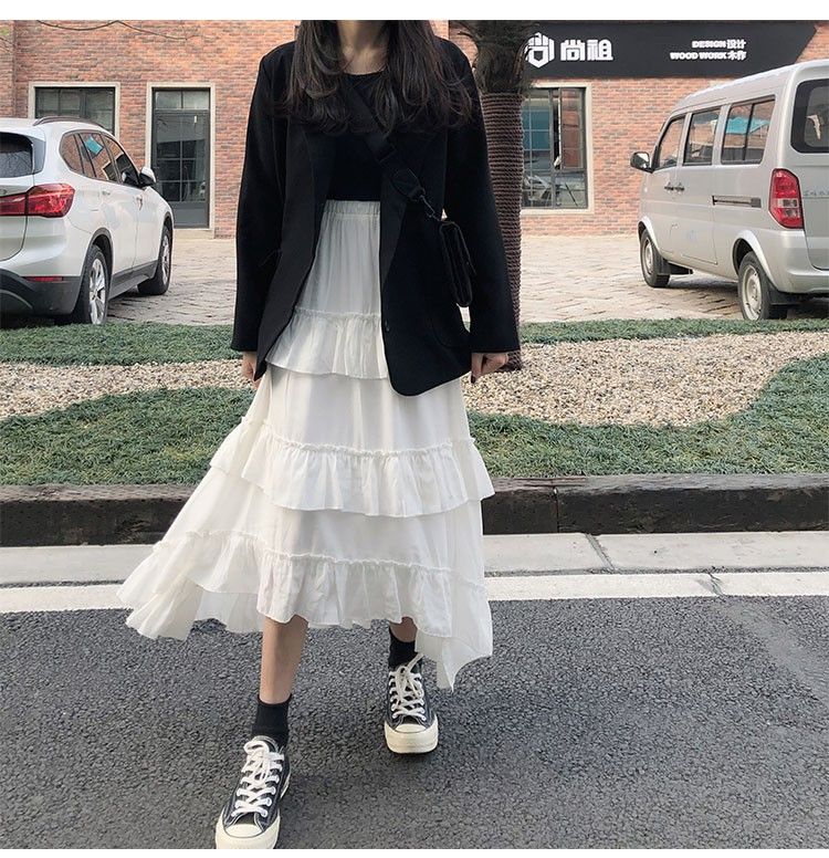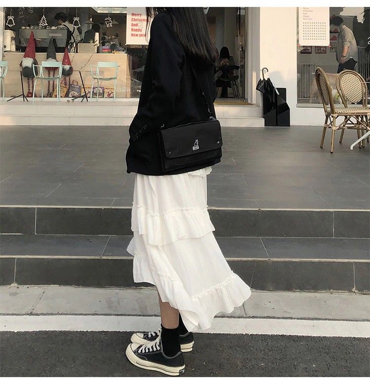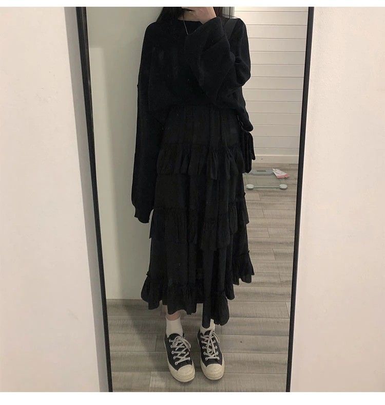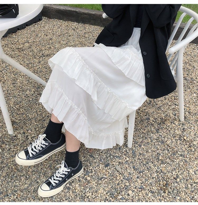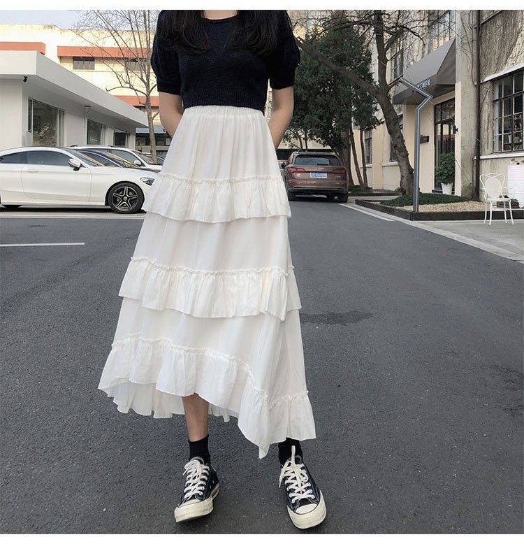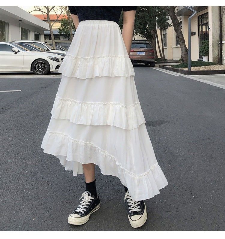 Qiukichonson ميدي التنانير الطويلة للمرأة ماكسي تنورة القوطي لوليتا الصيف عالية الخصر غير المتكافئة عالية منخفضة كشكش التنانير Rok