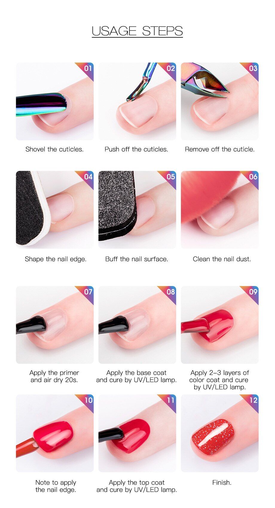 مواصفات الصنف: اسم العلامة التجارية: ROSALIND الاسم: الليزر الحجم: 10 مللي معالج: مصباح UV/LED الميزة: لها تأثير بريق الليزر. -الجودة هي أولويتنا الأولى. -خفيف ، بدون رائحة تقريبًا (فقط تحتوي كريم الأساس على رائحة معتدلة) ، نطبق فقط نسيج عضوي لحماية صحتك. -سيظل اللون يلمع حتى 30 يومًا. -ألوان Hotting اختيارية ، مناسبة لجميع المناسبات. خطوة بخطوة: -1. شكل الأظافر. إفشل سطح صفيحة الأظافر قليلاً. تطهير. -2. ضع طبقة أساسية من الأساس من الجلد إلى الحافة الحرة (تذكر إغلاق حافة الظفر). علاج الأظافر تحت درجة الحرارة لمدة 10 ثوانٍ أو ضوء الأشعة فوق البنفسجية لمدة دقيقتين. -3. تطبيق طبقة رقيقة من لون طلاء جل نقع في الاختيار. حافة خالية من الغطاء. العلاج: 30 ثانية في مصباح LED ، أو 2 دقيقة في مصباح الأشعة فوق البنفسجية. -4. كرر الطبقة الرقيقة الثانية من طلاء الجل نقع الأظافر. علاج تحت مصباح LED لمدة 30 ثانية أو ضوء الأشعة فوق البنفسجية لمدة دقيقتين. -5. تطبيق درجة. حافة خالية من الغطاء. العلاج: 30 ثانية في مصباح LED. -6. إزالة البقايا اللزجة على الأظافر بالمطهر. ثم ، قم بتغذية زيت البشرة لإعادة ترطيب الرطوبة في البشرة والجلد المحيط بالأظافر. لإزالة: -1. نقع الأظافر في مزيل الأكريليك لمدة 5 دقائق. -2. مزق قطعة كاملة من مينا الأظافر بلطف على كل مسمار. الحذر: 1. الحجم 10 مللي. بما أن سعة الزجاجة تزيد عن 10 مللي ، لن تملأ المنطقة بالكامل بالزجاجة! 2. حافظ على الإغلاق بإحكام. حافظ على ضوء الشمس. يحفظ بعيدًا عن متناول الأطفال.