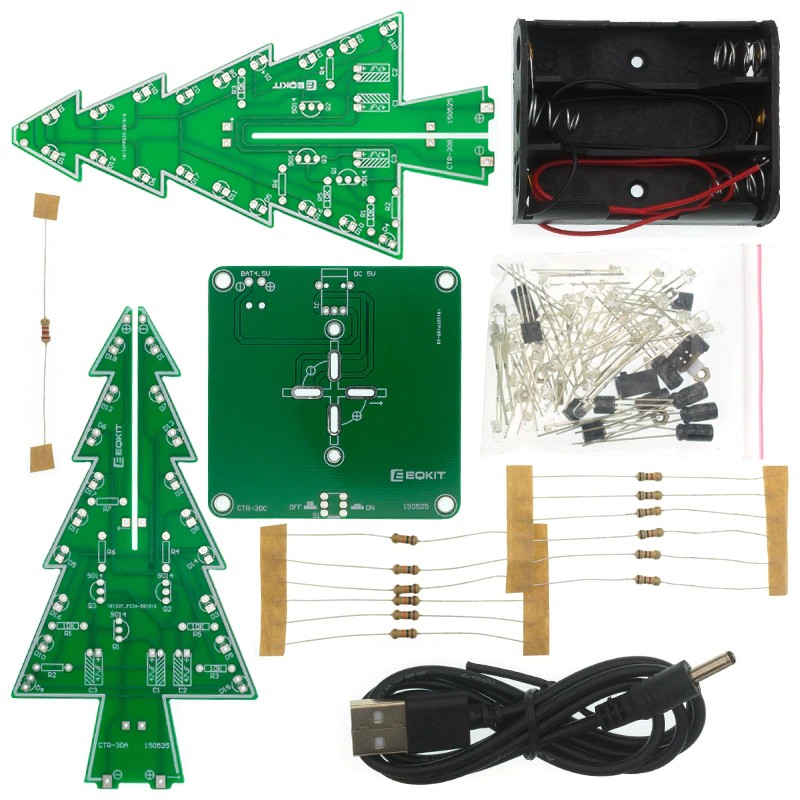 تتكون هذه الدائرة من 16 قطعة LED (صمام ثنائي باعث للضوء). 16 قطعة LED مقسمة إلى أربع مجموعات ، وكل مجموعة لديها ترددات وامضة مختلفة ، عندما فلاش أربع مجموعات معا ، وهذا العنصر يبدو وكأنه شجرة عيد الميلاد الصغيرة. يتم تشغيل الدائرة بواسطة بطارية 9 فولت.