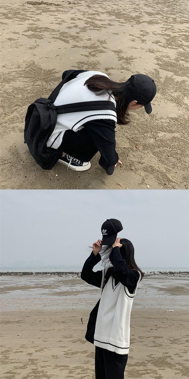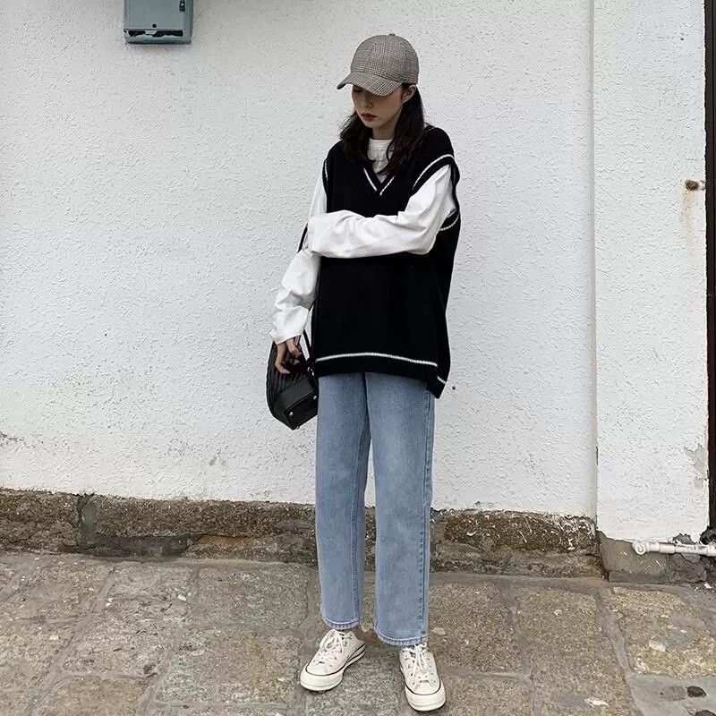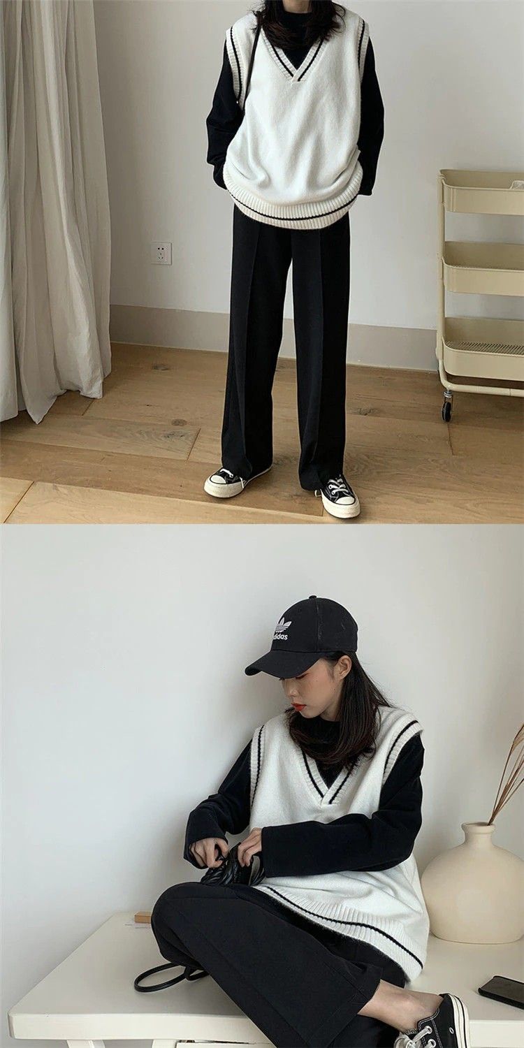 Vangull-سترة نسائية محبوكة برقبة على شكل V ، سترة بسيطة بدون أكمام على الطراز الكوري ، سترة ترفيهية كلاسيكية للطلاب