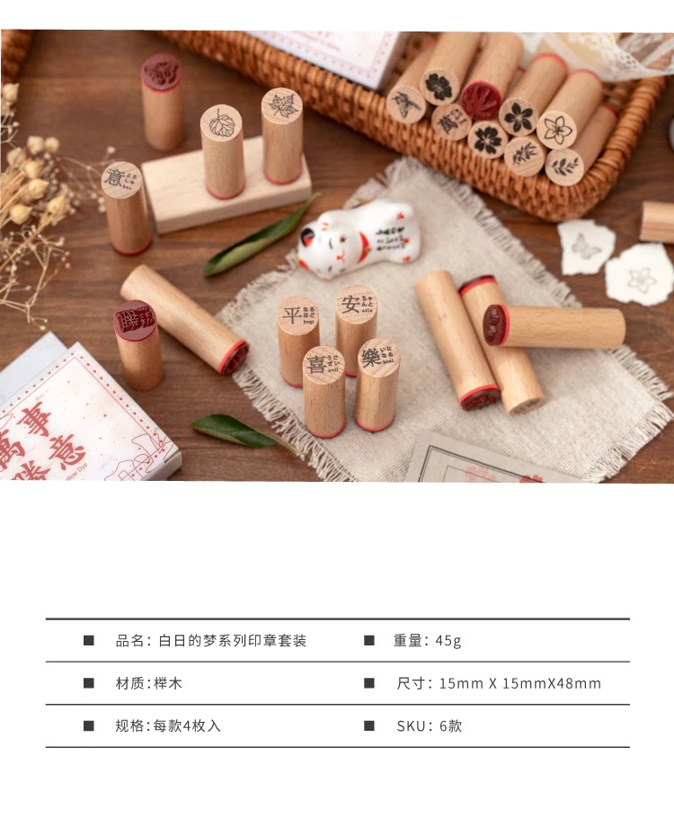 النوع: طوابع مطاطية خشبية المواد: مطاط الخشب نمط: 6 تصميم الحجم: 15 مللي متر * 15 مللي متر * 48 مللي متر الكمية: 4 قطعة/تصميم الوزن: 46 جم الحزمة: محاصر حجم العبوة: 65*20*55 مللي متر
