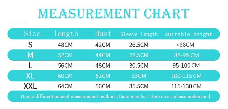XXXL: länge 72CM brustumfang 60CM Länge der hülse 42CM Geeignet für höhe 130-140CM