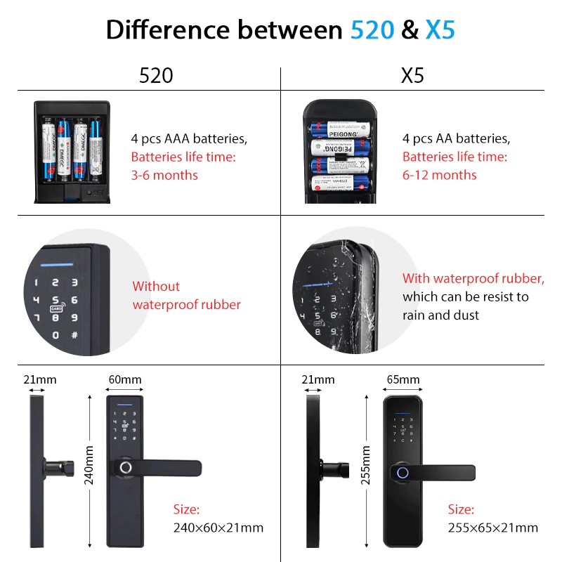 X5-the neueste verbesserte tuya fingerprint lock von 2021, Im Vergleich zu 520 modell, in auftrag zu erfüllen unsere markt anforderungen, wir haben das geändert schloss größen von 240*60mm zu 255*65mm, und 4 stücke AAA batterien ladung zu 4 stücke AA, die batterien leben können werden dauerte für mehr als 6 monate. Neben, wir hinzugefügt wasserdichte gummi zu verbessern die safty und haltbarkeit.