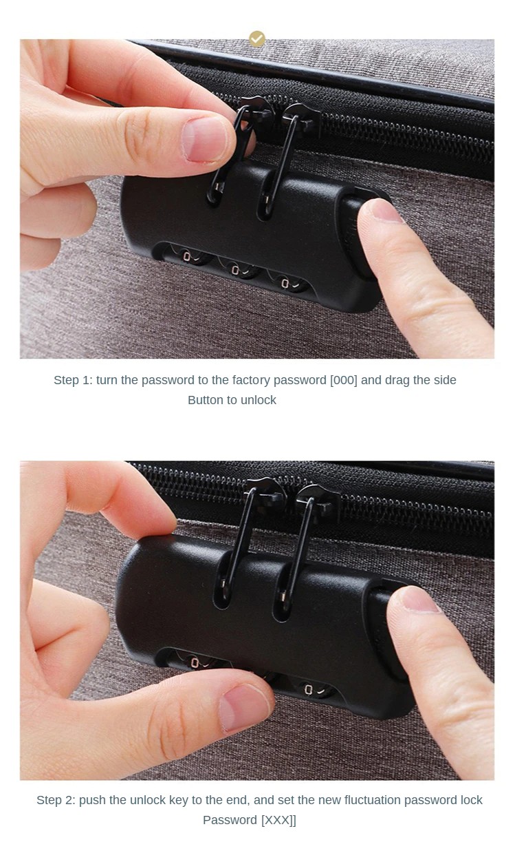 4. Locking methode: Drücken Sie die taste auf der rechten hand und ziehen es heraus. Die links hand picks up die zipper kopf und schnallen es zu die code lock. Dann release die schlüssel und die zipper kopf wird nicht, was darauf hinweist, dass die sperre wurde erfolgreich abgeschlossen
