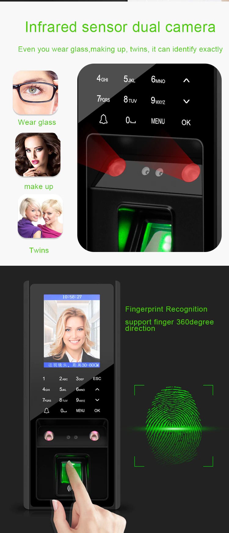 Die NX7 eigenschaften die schnellsten handels-basierte fingerabdruck-matching-algorithmus und hohe-bild qualität infrarot erkennung fingerprint sensor. Das gerät bietet flexibilität, INSTALLIERT werden eigenständig oder mit dritten party zugangskontrolle panels'. , Dass unterstützung standard Wiegand signal. Alle operationen können durchgeführt werden auf die TFT-LCD farbe bildschirm. Die fingerprint und gesicht bild wird angezeigt auf es. , Dass wird guide benutzer zu setzen finger auf richtige position und erhöhen anerkennung rate. TCP/IP und U disk sind verfügbar, dass das gerät kann verwendet werden in verschiedenen netzwerk