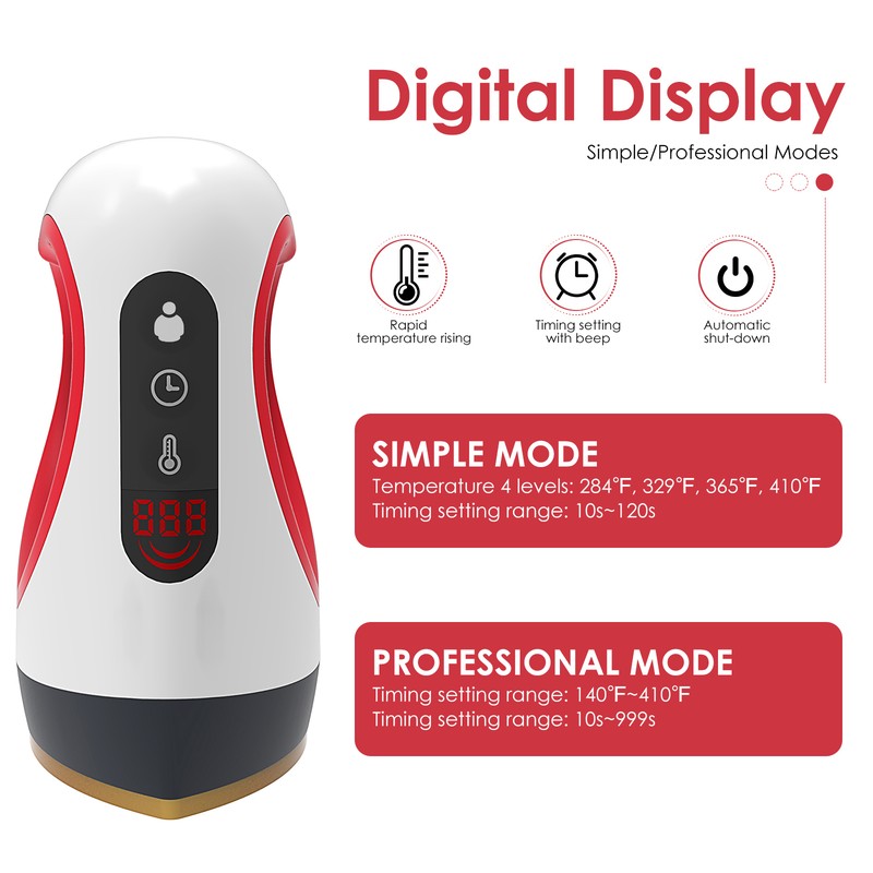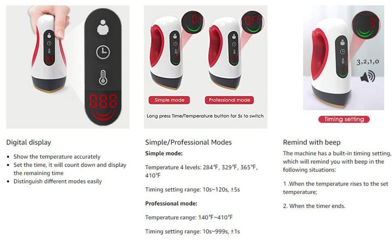 【Simple Modus & Professionelle Mode】the einfache modus haben 4 temperaturen, und die betriebs zeit kann jeder zeit zwischen 10-120 sekunden. Die professionelle modus können eingestellt werden bei jeder temperatur zwischen 284-410 °F und die betriebs zeit kann überall zwischen 10-999 sekunden. die schlüssel betrieb methode ist relativ kompliziert, entnehmen sie bitte dem handbuch.