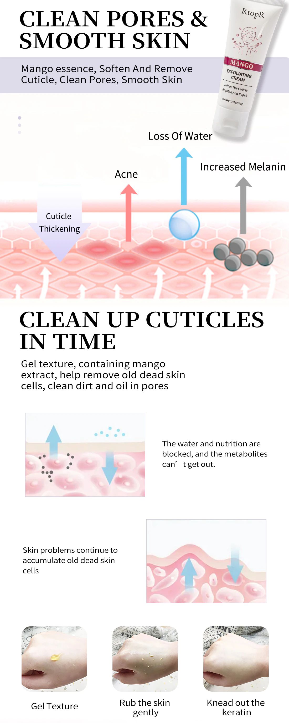 Gel textur, enthält mango essenz, hilft erweichen die häutchen und entfernt alte abgestorbene geil, reinigt und dringt die schmutz und fettig innen poren, erhöht die glanz und durchlässigkeit der haut, beruhigt und reparaturen die muscle oberfläche, lassen sie ihre haut rein und glänzend.