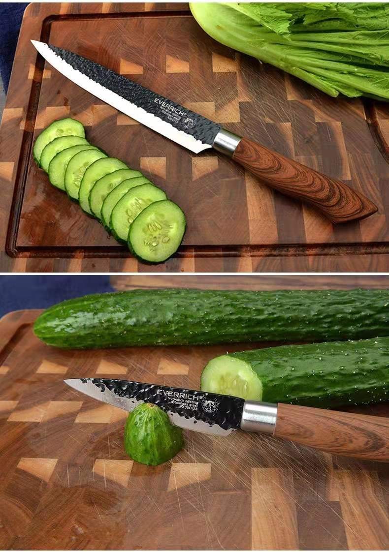 Extrem sharp: Jedes messer klinge ist aus geschmiedet high carbon stahl. Die klingen sind dann hand-sharp ened und schließlich satin fertigen-, die bietet ein hervorragend sharp und effiziente rand, dass wird seine sharp ness für lange zeiträume, auch mit schwere täglichen gebrauch.