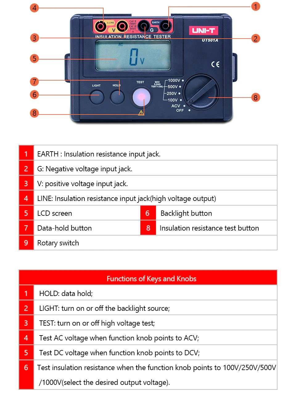 UT500 serie isolierung widerstand tester nimmt neue design durch die kombination und große skala integrierte schaltung und digitale schaltung, integrierte isolierung widerstand und dc spannung, ac spannung messung funktion parameter, wie; Höhere genauigkeit, stabile leistung, bequem und zuverlässigen betrieb. geeignet für transformator, motor, kabel, schalter, Elektrische geräte und andere elektrische geräte und mess isolierung widerstand von die isolierende material, ist von alle arten von elektrischen ausrüstung wartung, test und überprüfung werkzeuge.