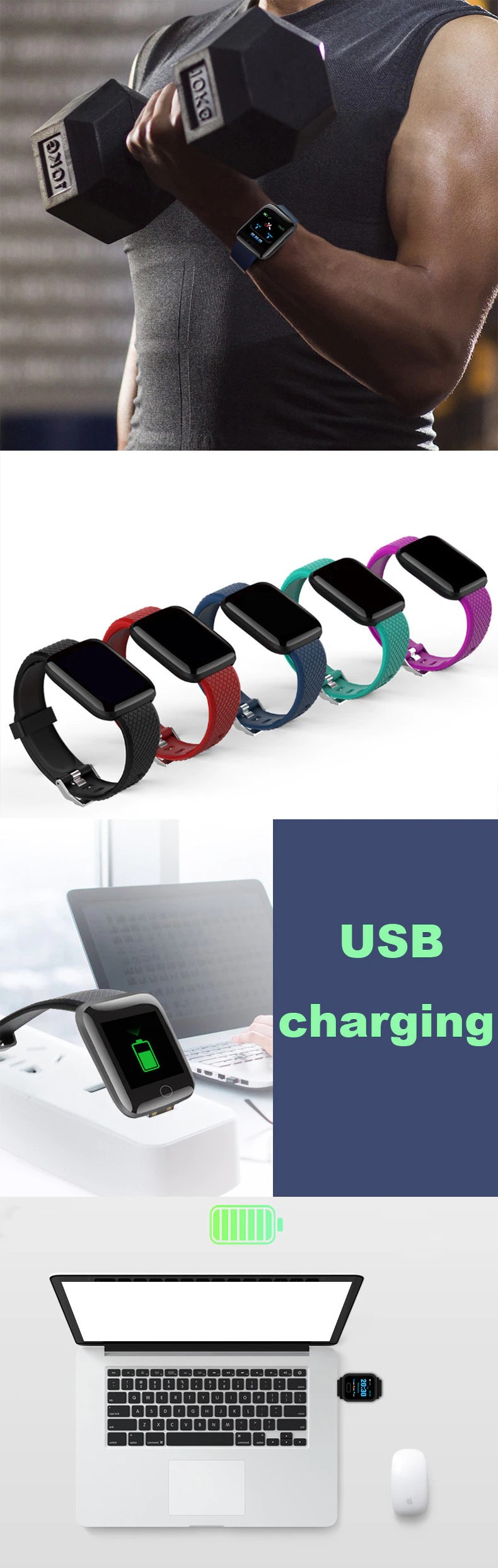 Remarque: chers acheteurs, cette montre ne nécessite pas de câble de charge, elle peut être chargée directement via la tête de charge ou l'interface USB (la tête de charge n'est pas incluse)