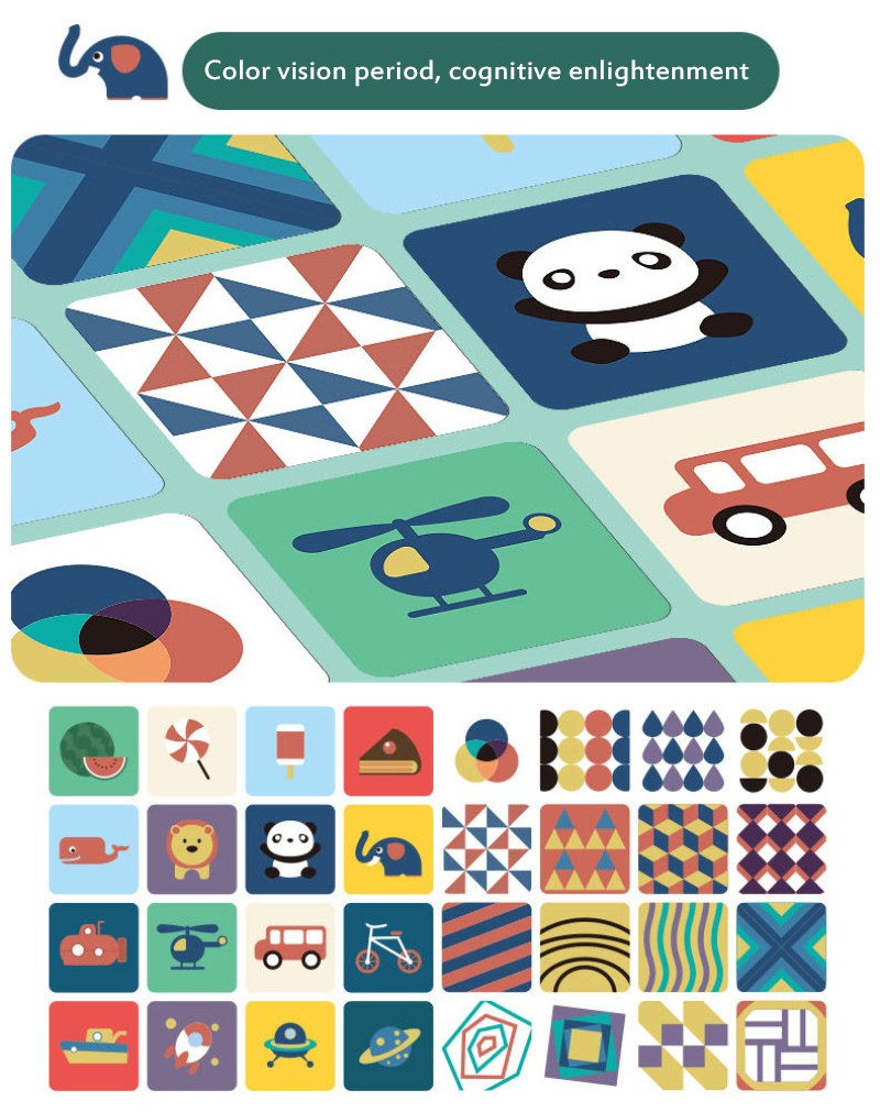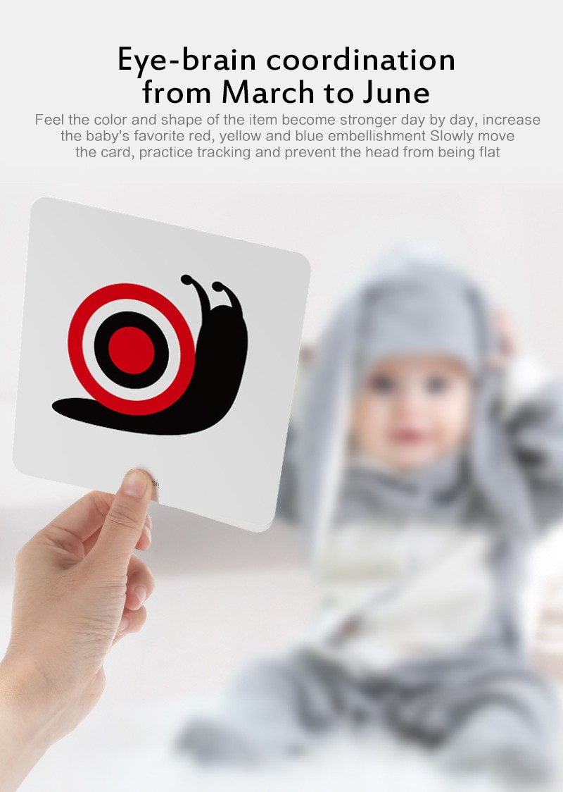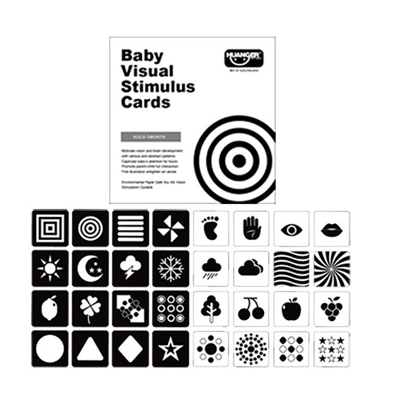Las cartas de doble cara y de gran tamaño están hechas de cartón grueso y presentan ilustraciones contrastantes basadas en la visión del bebé.