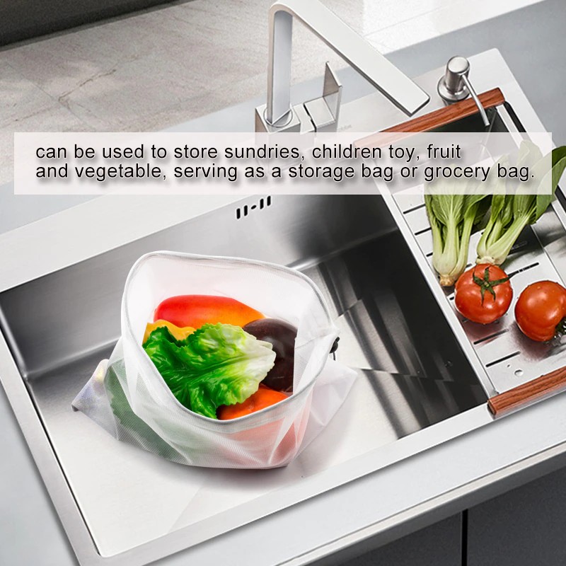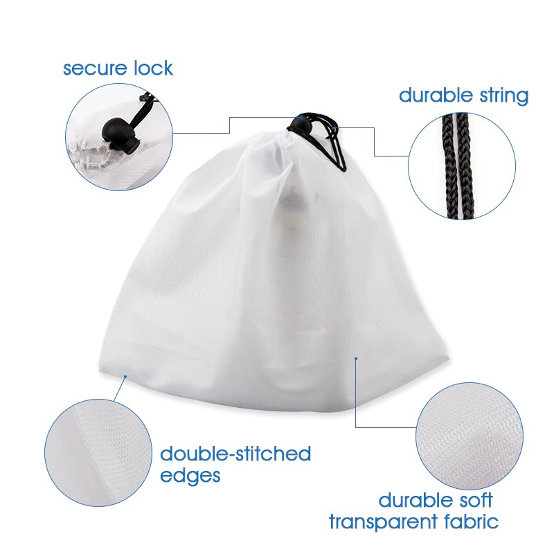 Está hecho de malla de poliéster fuerte, ligera, fácil de ver, sin plástico y que protege el medio ambiente. Nuestras bolsas de malla se pueden lavar a máquina.