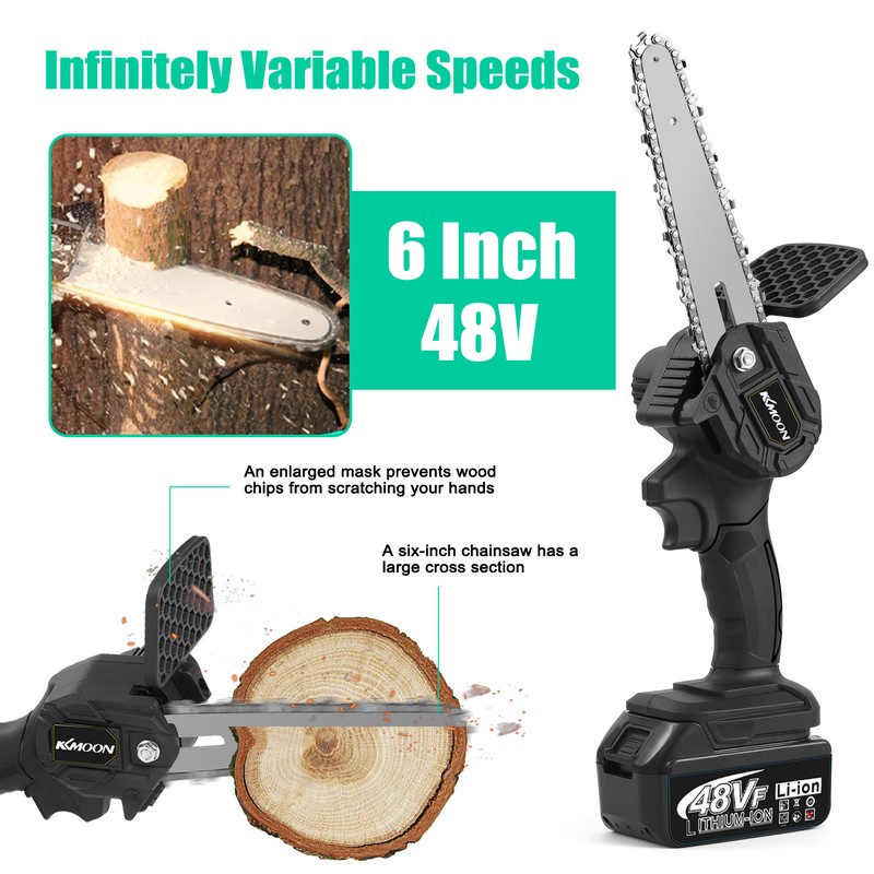 Este es un tipo de motosierra de podar de calidad, hecha de material de buena calidad, práctica, fácil de operar y usar, amplia gama de aplicaciones, tiene un largo tiempo de servicio. Adopta un motor de cepillo, arranque rápido, frenado oportuno, regulación de velocidad suave en un amplio rango, control relativamente simple del circuito, etc. La cadena de sierra se ha enfriado profundamente a altas temperaturas, con dientes de sierra afilados, más resistentes al desgaste, corte suave. Perfecto para podar, dividir leña, cortar madera, etc. Puedes probarlo.