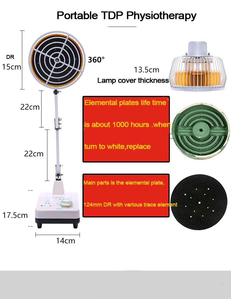 Característica 1. Lámpara de calor infrarroja TDP Flexible y duradera 2. Cabezal giratorio de 360 grados con temporizador de una tecla 3. Brazo ajustable de 125 grados 4. Diseño antiquemaduras con cubierta para lámpara 5.Anti-vuelco con placa base estabilizadora Rango de fisioterapia auxiliar: 1. Lesiones deportivas, periartritis 2. Tensión muscular Lumbar 3. Artritis reumática 4. Hiperosteogenia 5. Hernia de disco Lumbar Tamaño del paquete: 246x162x360mm Peso bruto: 4KG