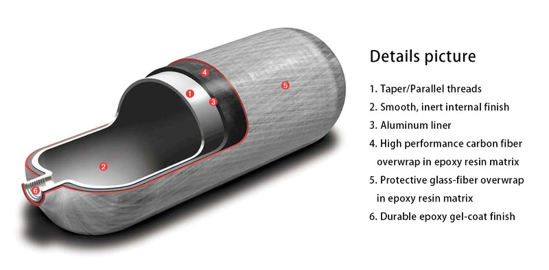 El interior de nuestro cilindro de fibra de carbono está hecho de material de aleación de aluminio 6061 de alta calidad, que en el exterior está envuelto con fibra de carbono importada y resina de vidrio para protección. Los productos han sido inspeccionados por presión de agua, hermeticidad, voladura, etc. antes de salir de fábrica. Garantizamos que cada producto está cualificado cuando sale de fábrica.