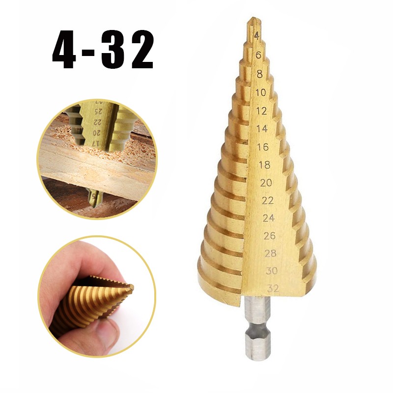 Brocas De Núcleo Hexagonal De Metal Recubierto Titanio Hss, Juego Brocas Escalonadas Acero Alta Velocidad, Cortador De Madera Cónico Métrico, 4 -32Mm