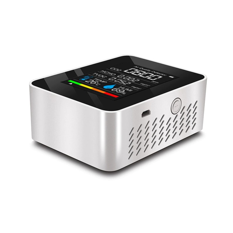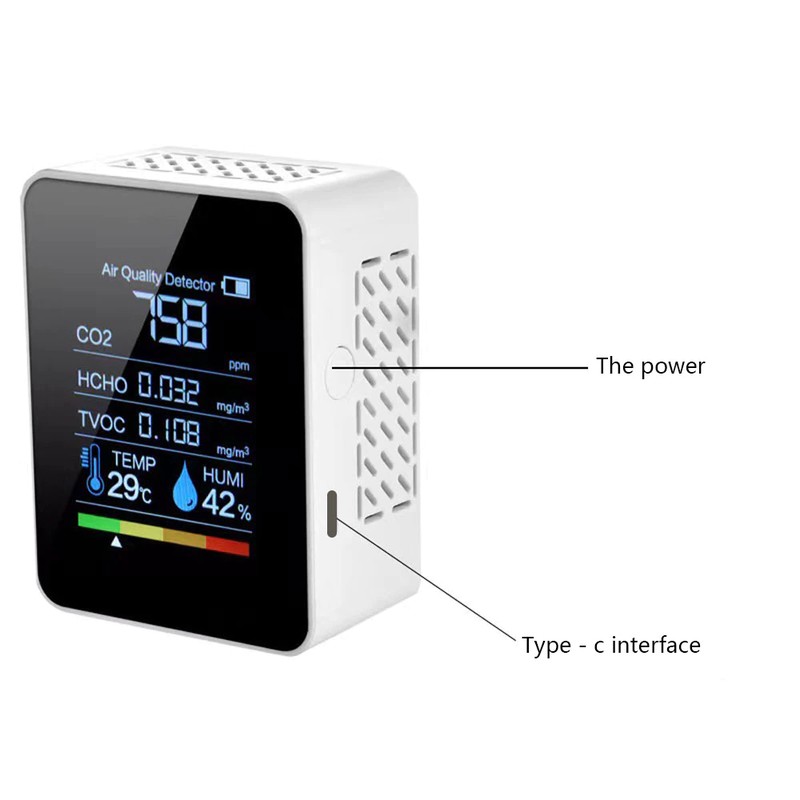 Gran pantalla LCD, puede ver la cantidad de electricidad, el valor de CO2, el valor de TVOC, el valor de HCHO, la temperatura y la humedad claramente.