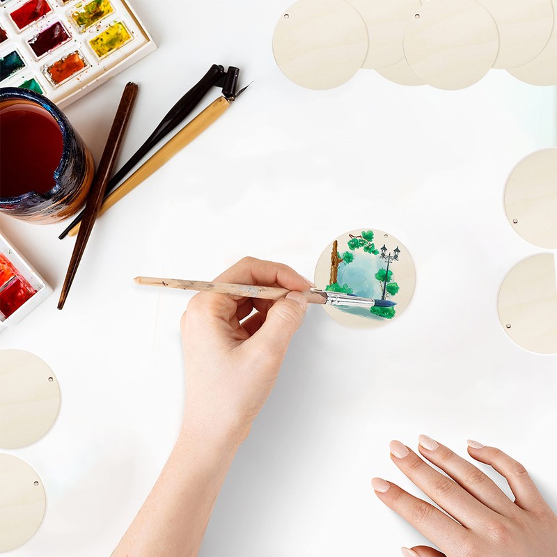 Fácil de colgar con hilo natural (no incluido). Estos discos de piezas de madera en blanco las etiquetas de madera se pueden enganchar y colgar en la pared, ventana, puerta, árbol de Navidad como decoración creativa.