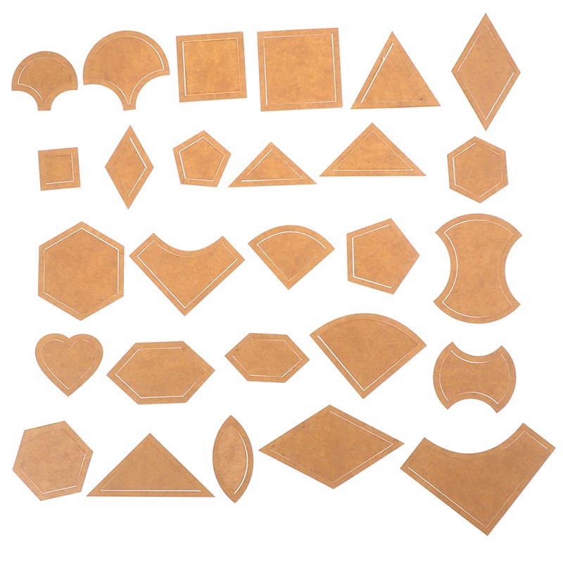 Cada figura se divide en dos partes, una parte es un margen de costura, y la otra parte es una muestra neta, incluye un círculo, hexágono, pentagon, cuadrado, triángulo, plantilla de diamantes y corazones.
