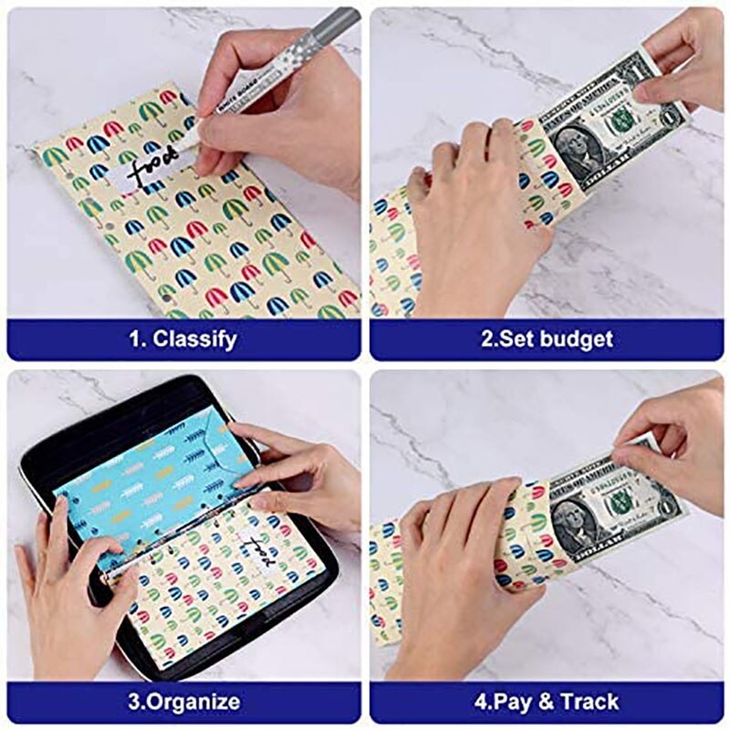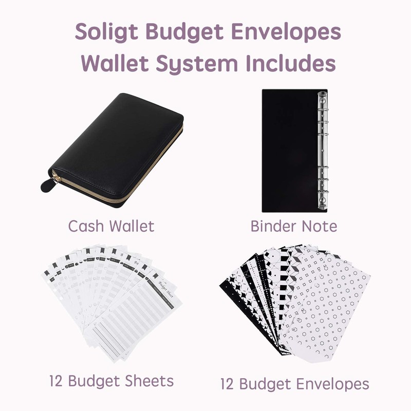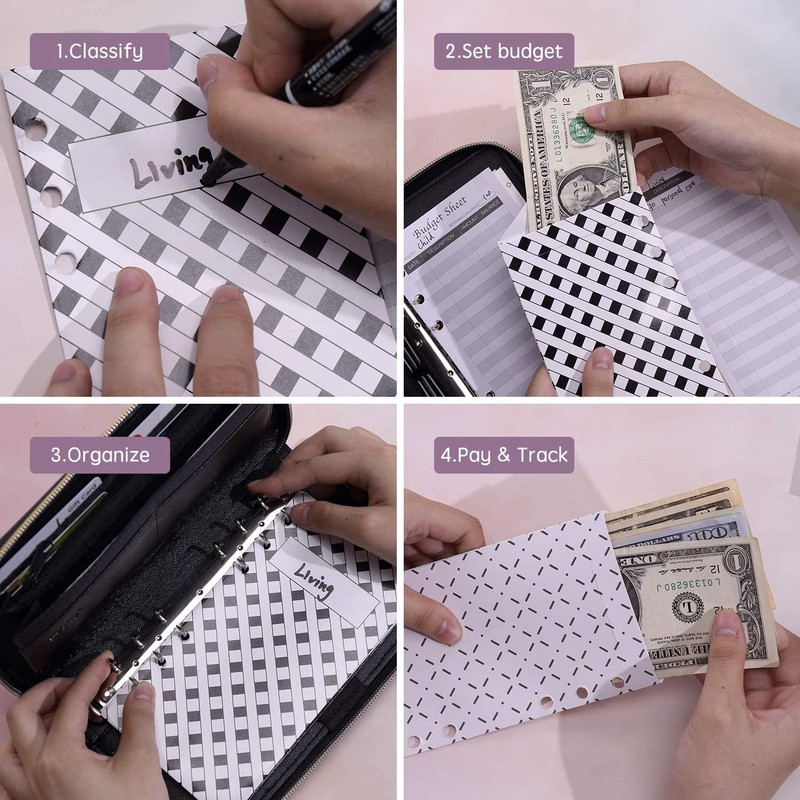 12 sobres, 12 hojas de presupuesto y 1 organización de carpetas de notas, 2 etiquetas