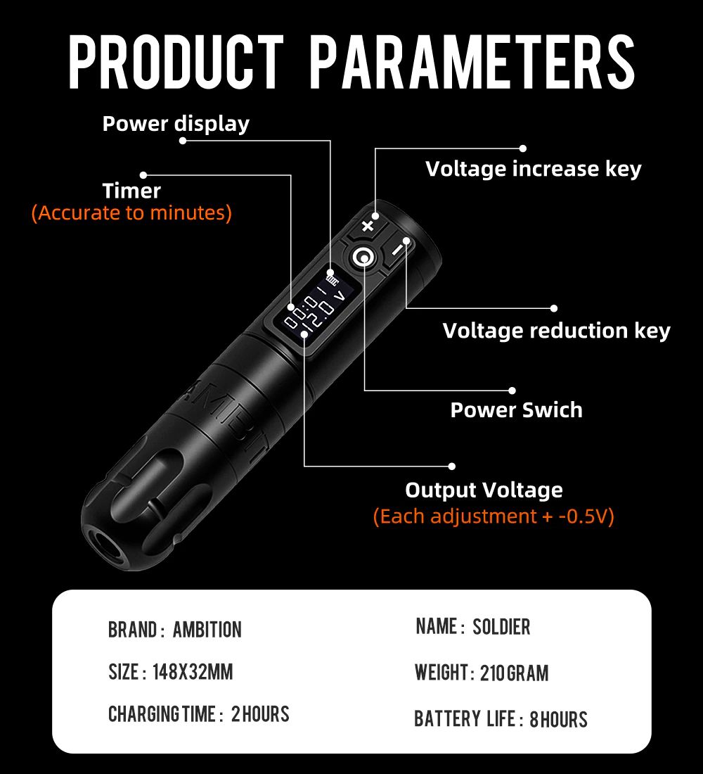 Ambition-Máquina De Tatuaje Inalámbrica Soldier, Batería Con Paquete De Energía Portátil, Pantalla Led Digital De 1950 Mah Para Arte Corporal